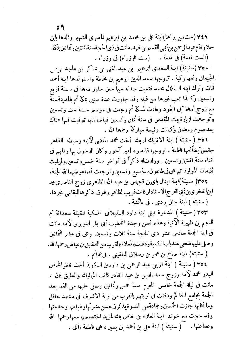 354 - (ستيتة) ابْنة الزين عبد الرَّحْمَن بن داودين الكويز أُخْت نَاظر الْخَاص الْبَدْر مُحَمَّد لأمه وَزوج سعد الدّين بن عبد الْقَادِر كَاتب المماليك والعليق كَانَ. مَاتَت فِي لَيْلَة الْجُمُعَة خَامِس الْمحرم سنة خمس وَثَمَانِينَ وَصلى عَلَيْهَا من الْغَد بعد الْجُمُعَة بِجَامِع الْحَاكِم ودفنت فِي تربتهم بِالْقربِ من تربة الاشرف فِي مشْهد حافل وَمَا أظنها جَازَت الْخمسين وَجَمَاعَة من النسْوَة يذكرن حسن عشرتها وطباعها وحشمتها وَقد حجت مَعَ خوند ابْنة الْعَلَاء بن خَاص بك لمزيد اختصاصها مَعهَا رَحمهَا الله وَعَفا عَنْهَا. (ستيتة) ابْنة عَليّ بن أَحْمد بن يسير، هِيَ فَاطِمَة تَأتي
