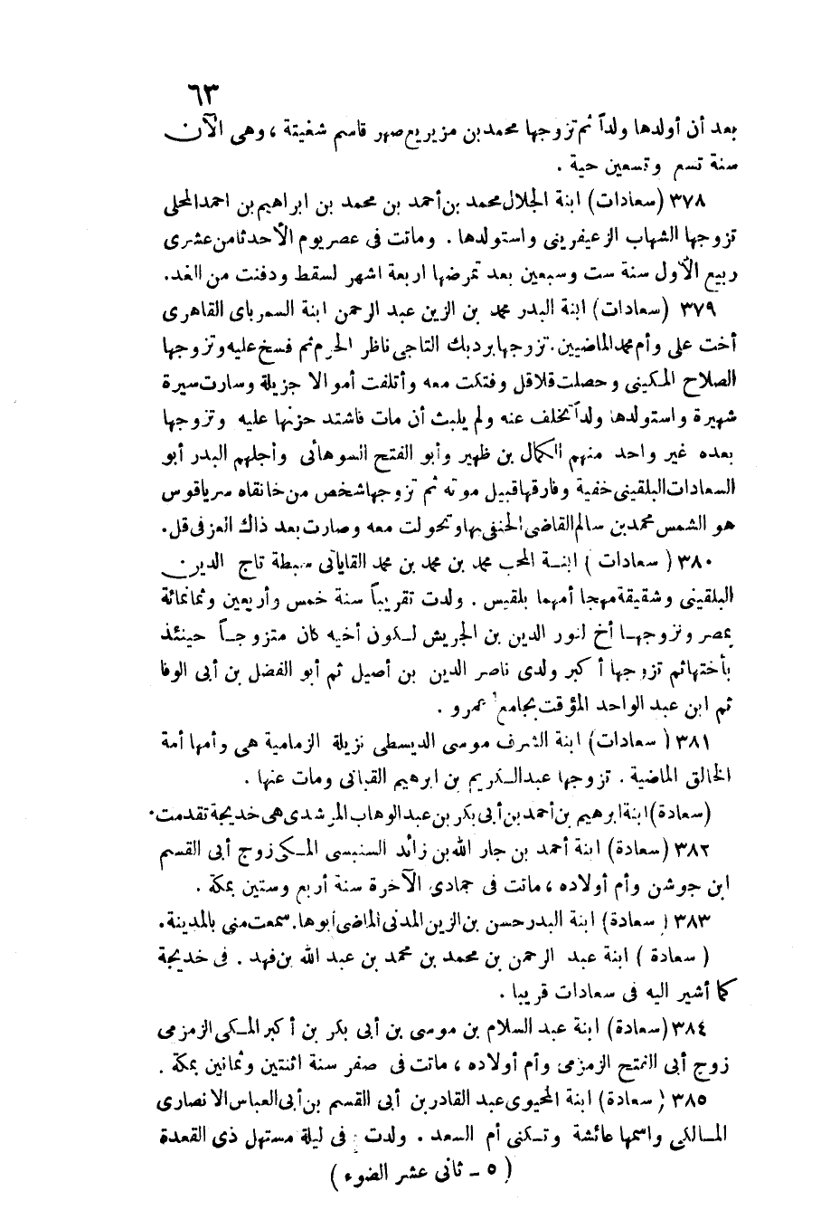 379 - (سعادات) ابْنة الْبَدْر مُحَمَّد بن الزين عبد الرَّحْمَن ابْنة السمرباي القاهري أُخْت عَليّ وَأم مُحَمَّد الماضيين. تزَوجهَا بردبك التاجي نَاظر الْحرم ثمَّ فسخ عَلَيْهِ وَتَزَوجهَا الصّلاح المكيني وحصلت قلاقل فتكت مَعَه وأتلفت أَمْوَالًا جزيلة وسارت سيرة شهيرة واستولدها ولدا تخلف عَنهُ وَلم يلبث أَن مَاتَ فَاشْتَدَّ حزنها عَلَيْهِ وَتَزَوجهَا بعده غير وَاحِد مِنْهُم الْكَمَال بن ظهير وَأَبُو الْفَتْح السوهائي وأجلهم الْبَدْر أَبُو السعادات البُلْقِينِيّ خُفْيَة وفارقها قبيل مَوته ثمَّ تزَوجهَا شخص من خانقاه سرياقوس هُوَ الشَّمْس مُحَمَّد بن سَالم القَاضِي الْحَنَفِيّ بهَا وتحولت مَعَه وَصَارَت بعد ذَلِك الْعِزّ فِي قل