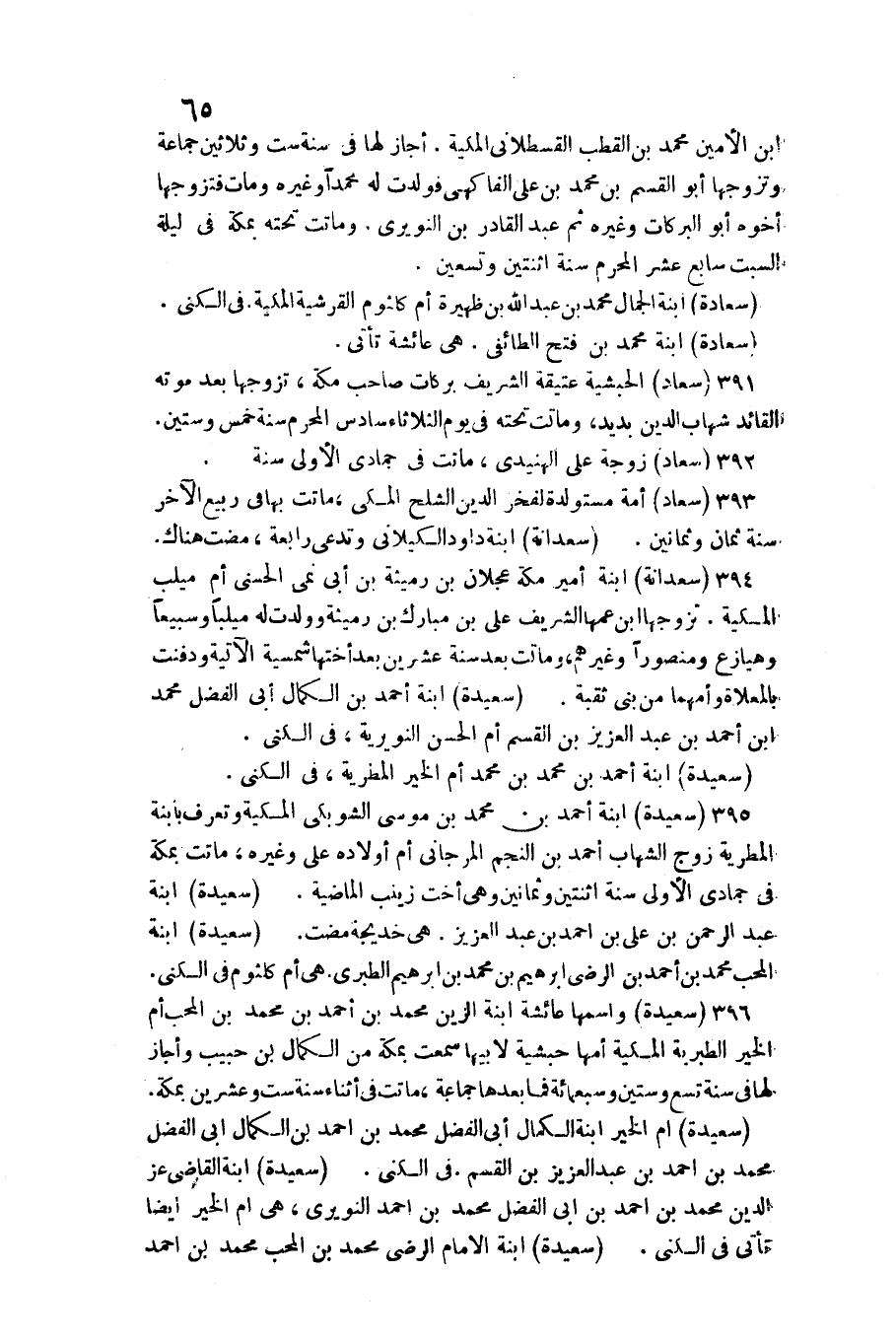 395 - (سعيدة) ابْنة أَحْمد بن مُحَمَّد بن مُوسَى الشوبكي المكية وتعرف بابنة المطرية زوج الشهَاب أَحْمد بن النَّجْم الْمرْجَانِي أم أَوْلَاده على وَغَيره، مَاتَت بِمَكَّة فِي جُمَادَى الأولى سنة اثْنَتَيْنِ وَثَمَانِينَ وَهِي أُخْت زَيْنَب الْمَاضِيَة. (سعيدة) ابْنة عبد الرَّحْمَن بن عَليّ بن احْمَد بن عبد الْعَزِيز. هِيَ خَدِيجَة مَضَت. (سعيدة) ابْنة الْمُحب مُحَمَّد بن أَحْمد بن الرضى ابراهيم بن مُحَمَّد بن ابراهيم الطَّبَرِيّ هِيَ أم كُلْثُوم فِي الكنى