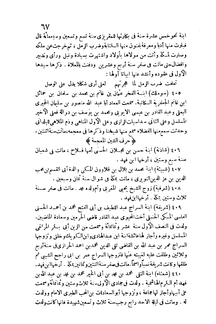406 - (شاذنة) ابْنة حسن بن عجلَان الْحسنى أمهَا فلاح، مَاتَت فِي شعْبَان سنة سبع وَسِتِّينَ، أرخها ابْن فَهد