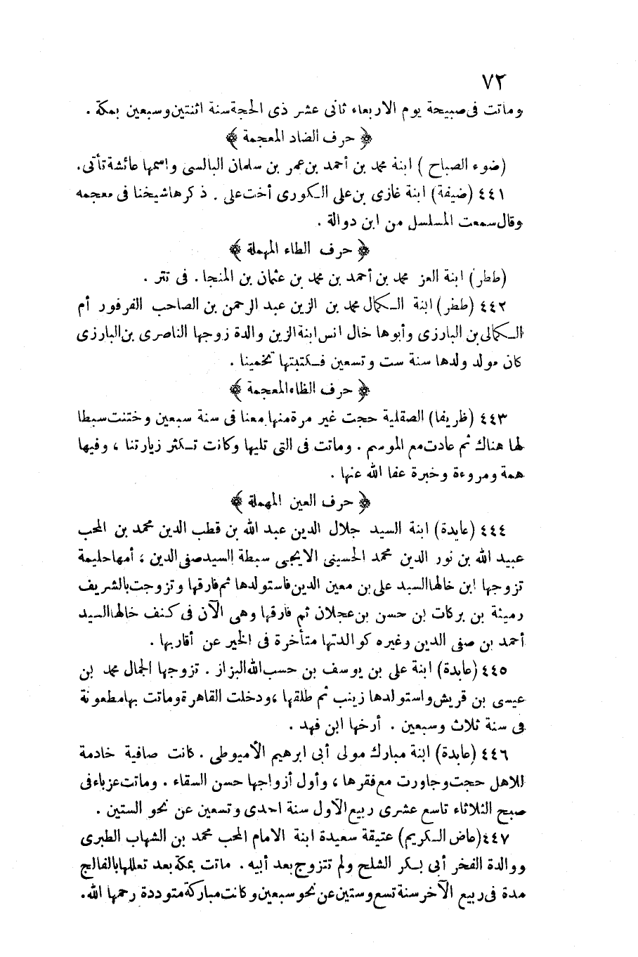 443 - (ظريفا) الصقلية حجت غير مرّة مِنْهَا مَعنا فِي سنة سبعين وختنت سبطا لَهَا هُنَاكَ ثمَّ عَادَتْ مَعَ الْمَوْسِم. وَمَاتَتْ فِي الَّتِي تَلِيهَا وَكَانَت تكْثر زيارتنا، وفيهَا همة ومروءة وخبرة عَفا الله عَنْهَا
