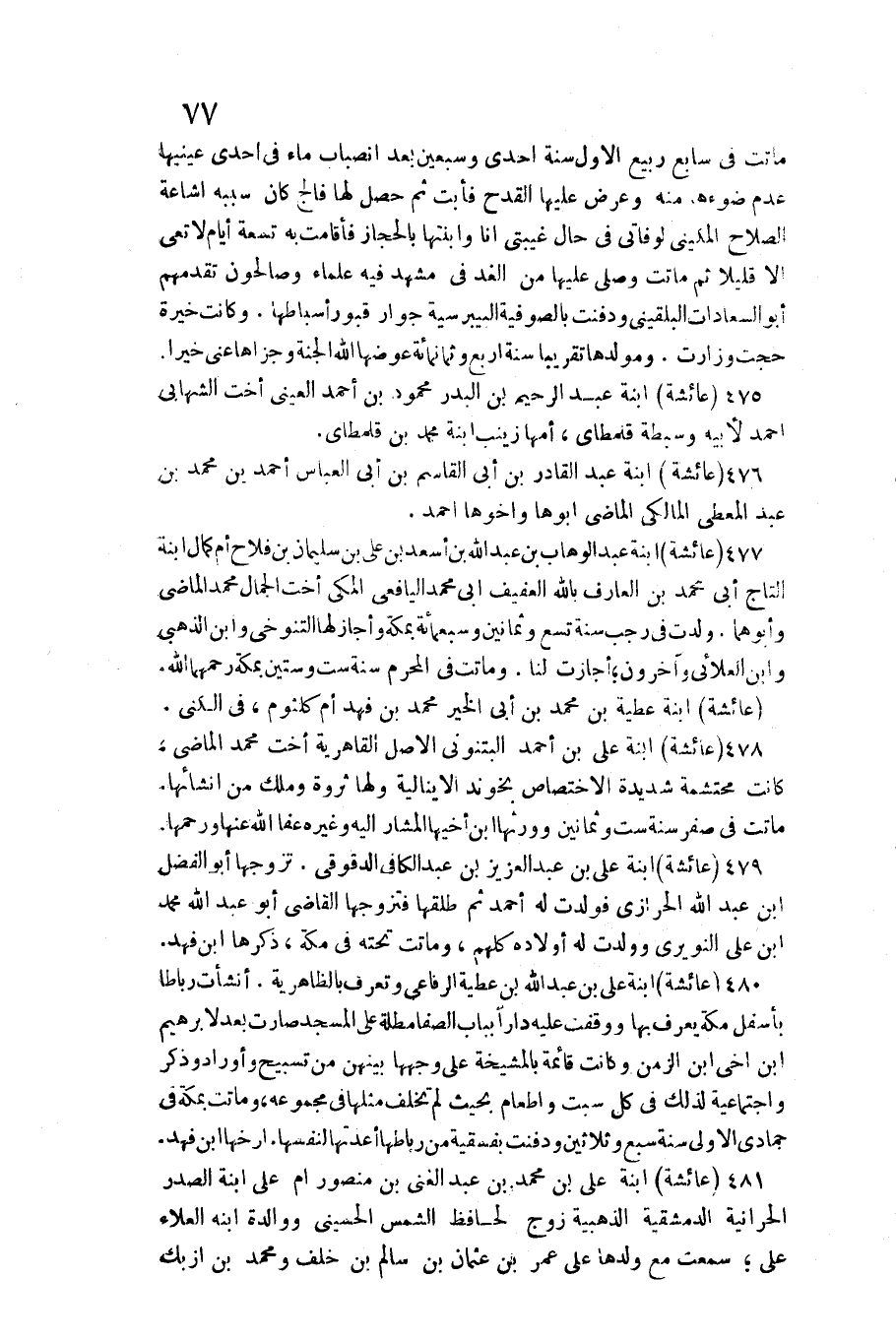 477 - (عَائِشَة) ابْنة عبد الْوَهَّاب بن عبد الله بن أسعد بن عَليّ بن سُلَيْمَان بن فلاح أم كَمَال ابْنة التَّاج أبي مُحَمَّد بن الْعَارِف بِاللَّه الْعَفِيف ابي مُحَمَّد اليافعي الْمَكِّيّ أُخْت الْجمال مُحَمَّد الْمَاضِي وأبوهما. ولدت فِي رَجَب سنة تسع وَثَمَانِينَ وَسَبْعمائة بِمَكَّة وَأَجَازَ لَهَا التنوخي وَابْن الذَّهَبِيّ وَابْن العلائي وَآخَرُونَ؛ أجازت لنا. وَمَاتَتْ فِي الْمحرم سنة سِتّ وَسِتِّينَ بِمَكَّة رحمهمَا الله
