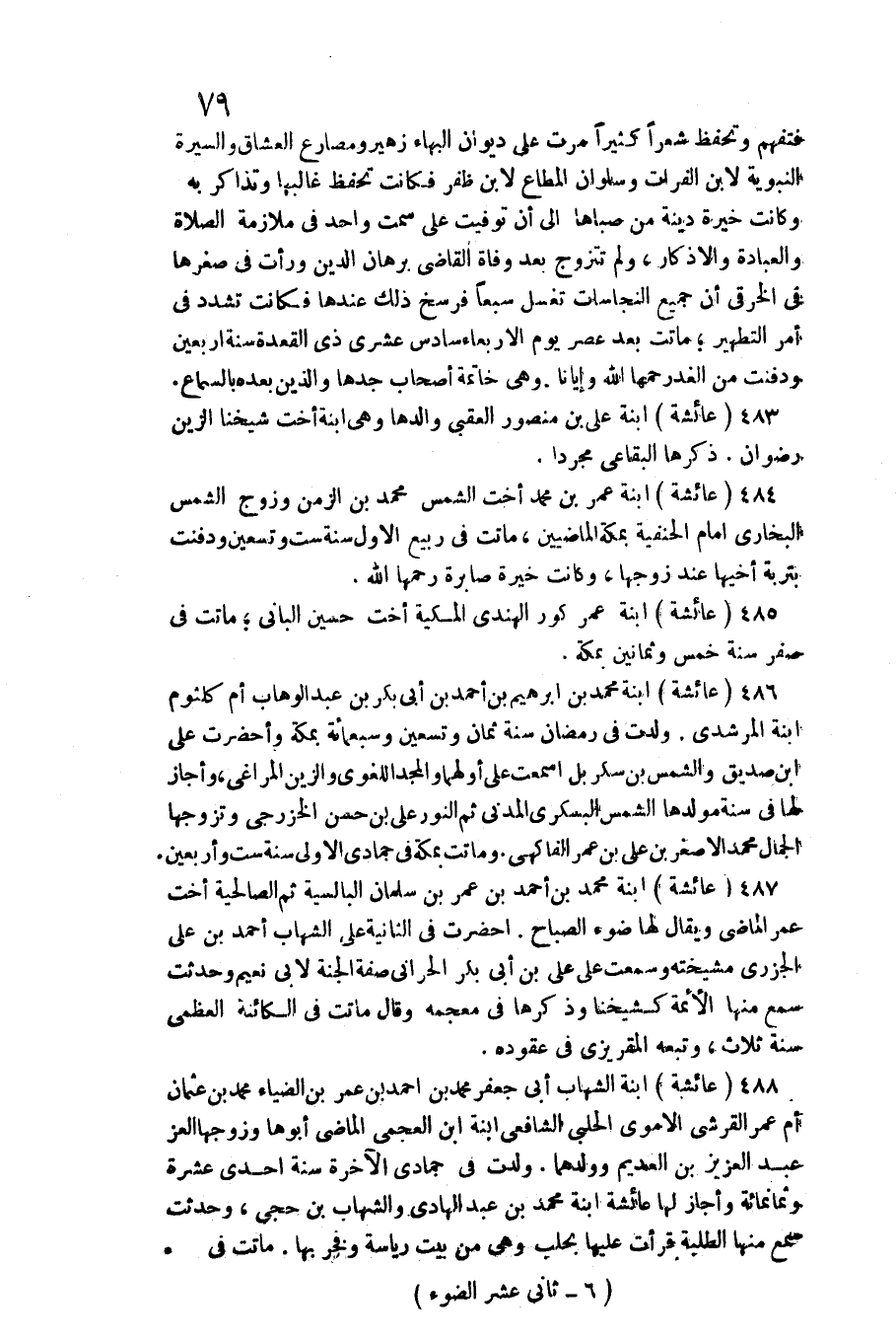484 - (عَائِشَة) ابْنة عمر بن مُحَمَّد أُخْت الشَّمْس مُحَمَّد بن الزَّمن وَزوج الشَّمْس البُخَارِيّ إِمَام الْحَنَفِيَّة بِمَكَّة الماضيين، مَاتَت فِي ربيع الأول سنة سِتّ وَتِسْعين ودفنت بتربة أَخِيهَا عِنْد زَوجهَا، وَكَانَت خيرة صابرة رَحمهَا الله