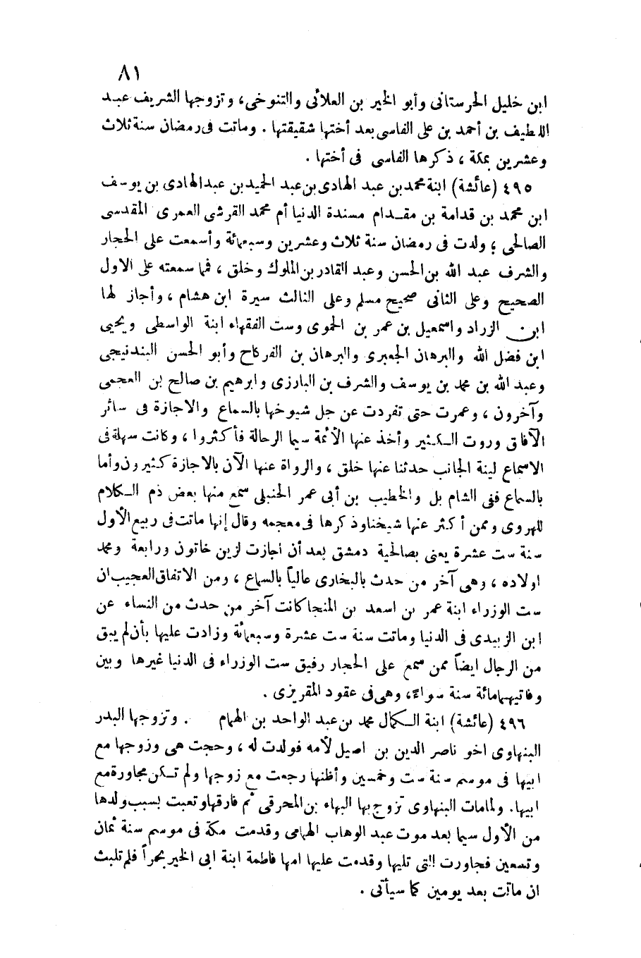 495 - (عَائِشَة) ابْنة مُحَمَّد بن عبد الْهَادِي بن عبد الحميد بن عبد الْهَادِي بن يُوسُف ابْن مُحَمَّد بن قدامَة بن مِقْدَام مُسندَة الدُّنْيَا أم مُحَمَّد الْقرشِي الْعمريّ الْمَقْدِسِي الصَّالِحِي؛ ولدت فِي رَمَضَان سنة ثَلَاث وَعشْرين وَسَبْعمائة وأسمعت على الحجار والشرف عبد الله بن الْحسن وَعبد الْقَادِر بن الْمُلُوك وَخلق، فمما سمعته على الاول الصَّحِيح وعَلى الثَّانِي صَحِيح مُسلم وعَلى الثَّالِث سيرة ابْن هِشَام، وَأَجَازَ لَهَا ابْن الزراد واسمعيل بن عمر بن الْحَمَوِيّ وست الْفُقَهَاء ابْنة الواسطى وَيحيى ابْن فضل الله والبرهان الجعبري والبرهان بن الفركاح وَأَبُو الْحسن الْبَنْدَنِيجِيّ وَعبد الله بن مُحَمَّد بن يُوسُف والشرف بن الْبَارِزِيّ وابراهيم بن صَالح بن العجمي وَآخَرُونَ، وعمرت حَتَّى تفردت عَن جلّ شيوخها بِالسَّمَاعِ والاجازة فِي سَائِر الْآفَاق وروت الْكثير وأخد عَنْهَا الْأَئِمَّة سِيمَا الرحالة فَأَكْثرُوا، وَكَانَت سهلة فِي الاسماع لينَة الْجَانِب حَدثنَا عَنْهَا خلق والرواة عَنْهَا الْآن بالاجازة كَثِيرُونَ وَأما بِالسَّمَاعِ فَفِي الشَّام بل والخطيب بن أبي عمر الْحَنْبَلِيّ سمع مِنْهَا بعض ذمّ الْكَلَام للهروى وَمِمَّنْ أَكثر عَنْهَا شَيخنَا وَذكرهَا فِي مُعْجَمه وَقَالَ إِنَّهَا مَاتَت فِي ربيع الأول سنة سِتّ عشرَة يعْنى بصالحية دمشق بعد أَن أجازت لزين خاتون ورابعة وَمُحَمّد اولاده، وَهِي آخر من حدث بالبخاري عالياُ بِالسَّمَاعِ، وَمن الِاتِّفَاق العجيب ان سِتّ الوزراء ابْنة عمر بن اِسْعَدْ بن المنجا كَانَت آخر من حدث من النِّسَاء عَن ابْن الزبيدِيّ فِي الدُّنْيَا وَمَاتَتْ سنة سِتّ عشرَة وَسَبْعمائة وزادت عَلَيْهَا بِأَن لم يبْق من الرِّجَال ايضاً مِمَّن سمع على الحجار رَفِيق سِتّ الوزراء فِي الدُّنْيَا غَيرهَا وَبَين وفاتيهما مائَة سنة سَوَاء، وَهِي فِي عُقُود المقريزى