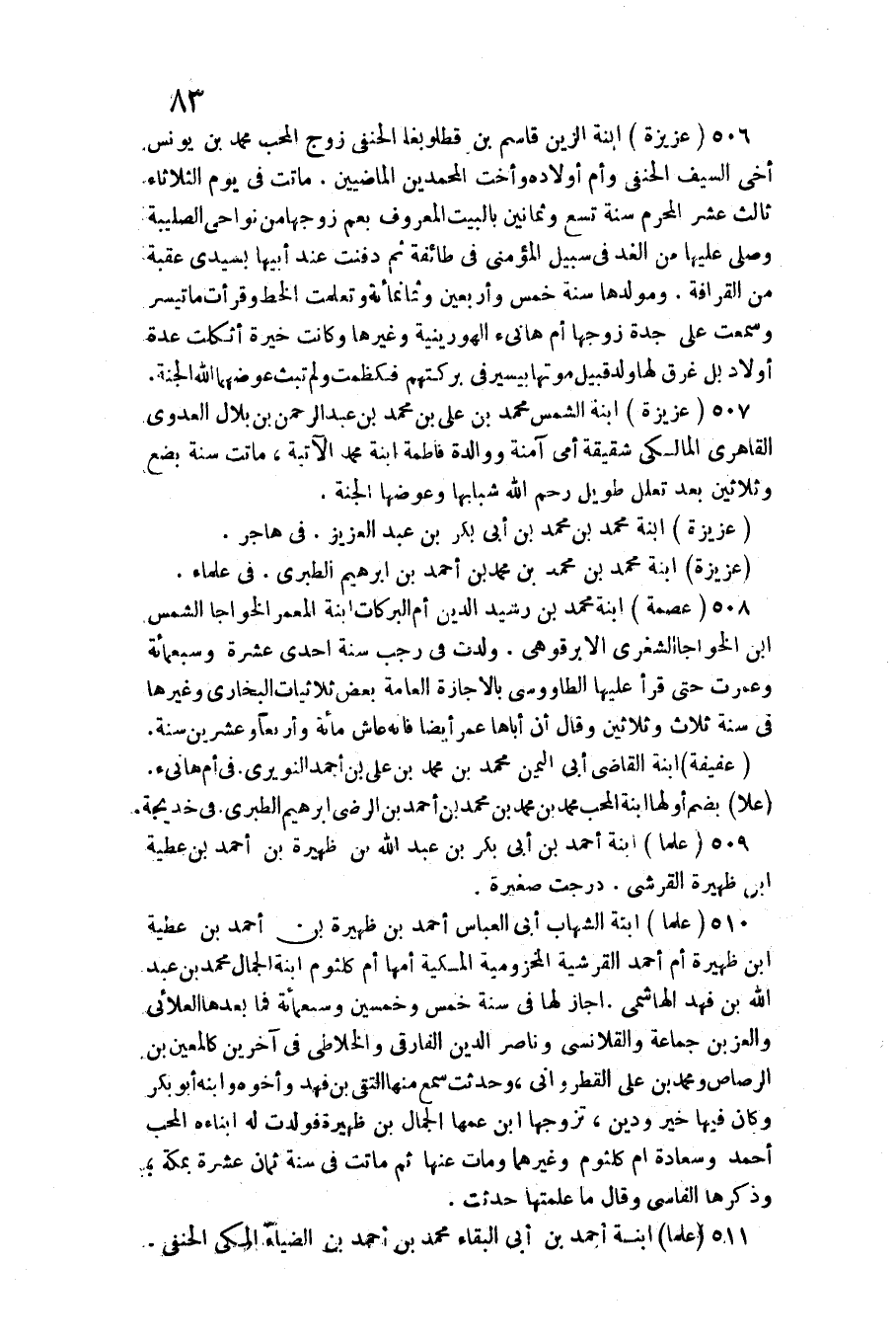 507 - (عزيزة) ابْنة الشَّمْس مُحَمَّد بن عَليّ بن مُحَمَّد بن عبد الرَّحْمَن بن بِلَال الْعَدوي القاهري الْمَالِكِي شَقِيقَة أُمِّي آمِنَة ووالدة فَاطِمَة ابْنة مُحَمَّد الْآتِيَة، مَاتَت سنة بضع وَثَلَاثِينَ بعد تعلل طَوِيل رحم الله شبابها وعوضها الْجنَّة