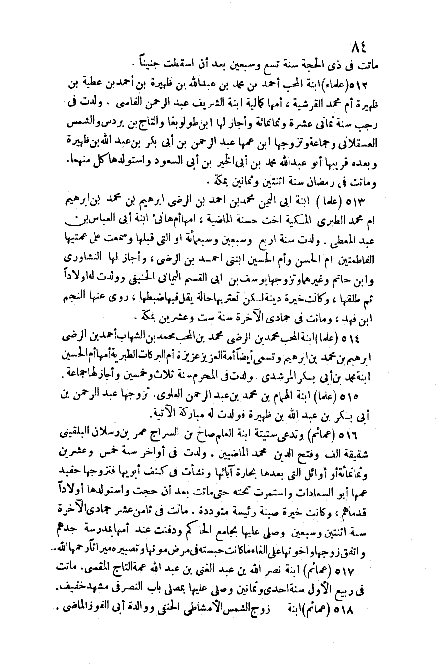 513 - (علما) ابْنة ابي الْيمن مُحَمَّد بن أَحْمد بن الرضى ابراهيم بن مُحَمَّد بن ابراهيم ام مُحَمَّد الطَّبَرِيّ المكية اخت حَسَنَة الْمَاضِيَة، امها أم هَانِئ ابْنة أبي الْعَبَّاس بن عبد الْمُعْطِي. ولدت سنة أَربع وَسبعين وَسَبْعمائة أَو الَّتِي قبلهَا وَسمعت على عمتيها الفاطمتين ام الْحسن وام الْحُسَيْن ابتي احْمَد بن الرضى، وَأَجَازَ لَهَا النشاورى وَابْن حَاتِم وَغَيرهمَا وَتَزَوجهَا يُوسُف بن أبي الْقسم الْيَمَانِيّ الحنيفي وَولدت لَهُ أَوْلَادًا ثمَّ طَلقهَا، وَكَانَت خيرة دينة لَكِن تعتريها حَالَة يقل فِيهَا ضَبطهَا، روى عَنْهَا النَّجْم ابْن فَهد، وَمَاتَتْ فِي جُمَادَى الْآخِرَة سنة سِتّ وَعشْرين بِمَكَّة