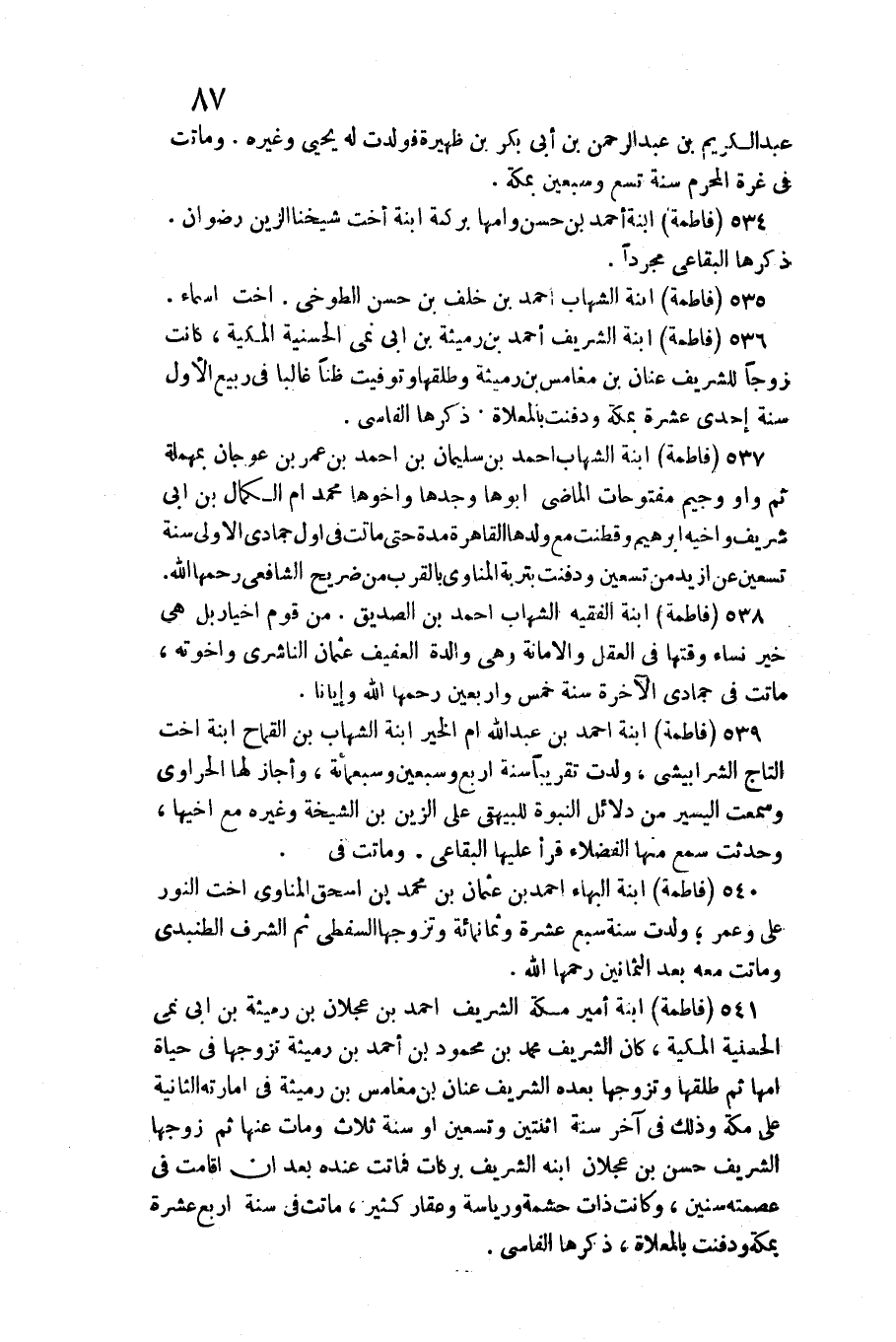 538 - (فَاطِمَة) ابْنة الْفَقِيه الشهَاب احْمَد بن الصّديق. من قوم اخيار بل هِيَ خير نسَاء وَقتهَا فِي الْعقل والامانة وَهِي وَالِدَة الْعَفِيف عُثْمَان النَّاشِرِيّ واخوته، مَاتَت فِي جُمَادَى الْآخِرَة سنة خمس وَأَرْبَعين رَحمهَا الله وإيانا