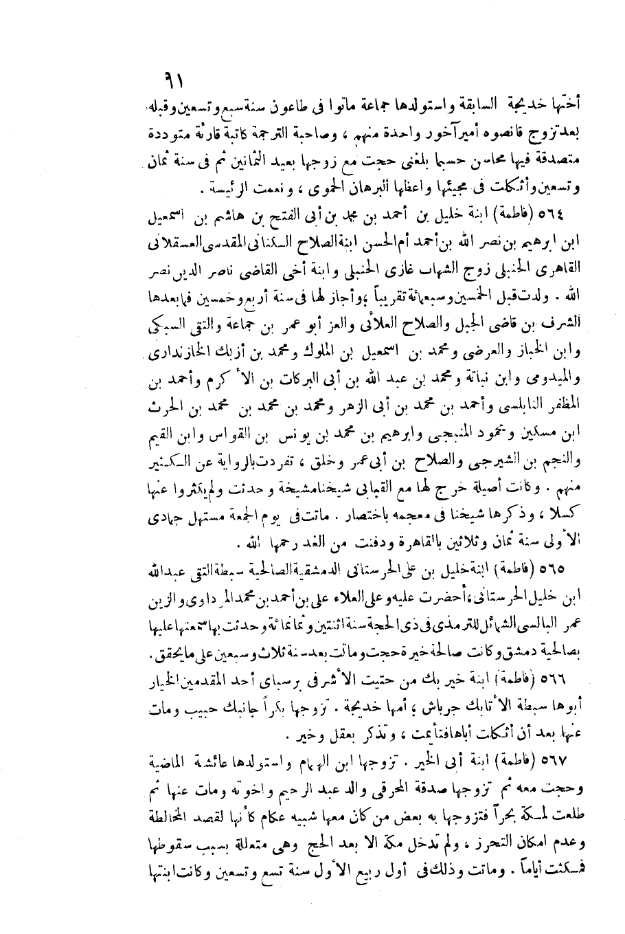 565 - (فَاطِمَة) ابْنة خَلِيل بن عَليّ الحرستاني الدمشقية الصالحية سبطة التقي عبد الله ابْن خَلِيل الحرستاني، أحضرت عَلَيْهِ وعَلى الْعَلَاء على بن أَحْمد بن مُحَمَّد المرداوي والزين عمر البالسي الشَّمَائِل لِلتِّرْمِذِي فِي ذِي الْحجَّة سنة اثْنَتَيْنِ وَثَمَانمِائَة وَحدثت بهَا سَمعتهَا عَلَيْهَا بصالحية دمشق وَكَانَت صَالِحَة خيرة حجت وَمَاتَتْ بعد سنة ثَلَاث وَسبعين على مَا يُحَقّق
