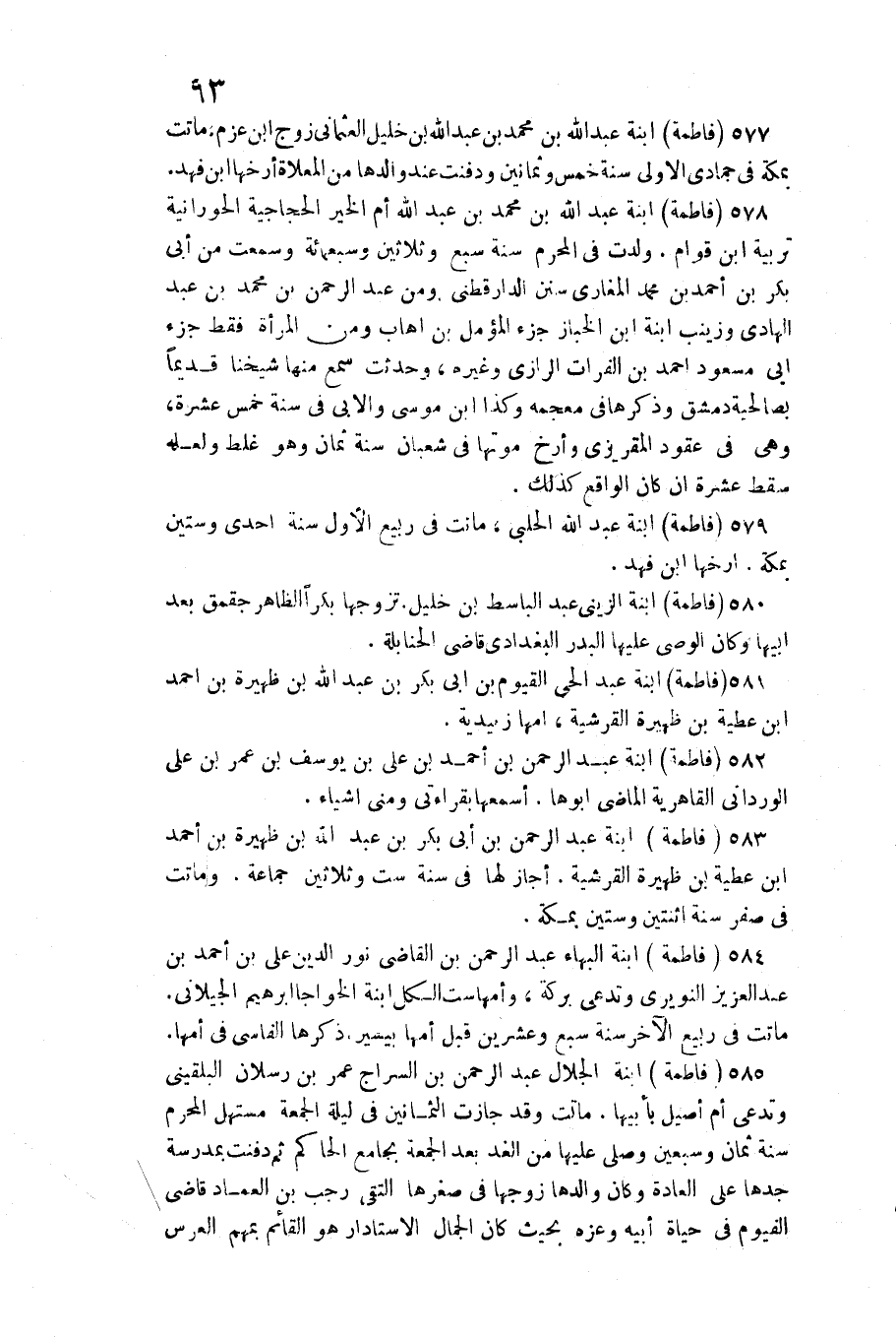 583 - (فَاطِمَة) ابْنة عبد الرَّحْمَن بن أبي بكر بن عبد الله بن ظهيرة بن أَحْمد ابْن عَطِيَّة بن ظهيرة القرشية. أجَاز لَهَا فِي سنة سِتّ وَثَلَاثِينَ جمَاعَة. وَمَاتَتْ فِي صفر سنة اثْنَتَيْنِ وَسِتِّينَ بِمَكَّة
