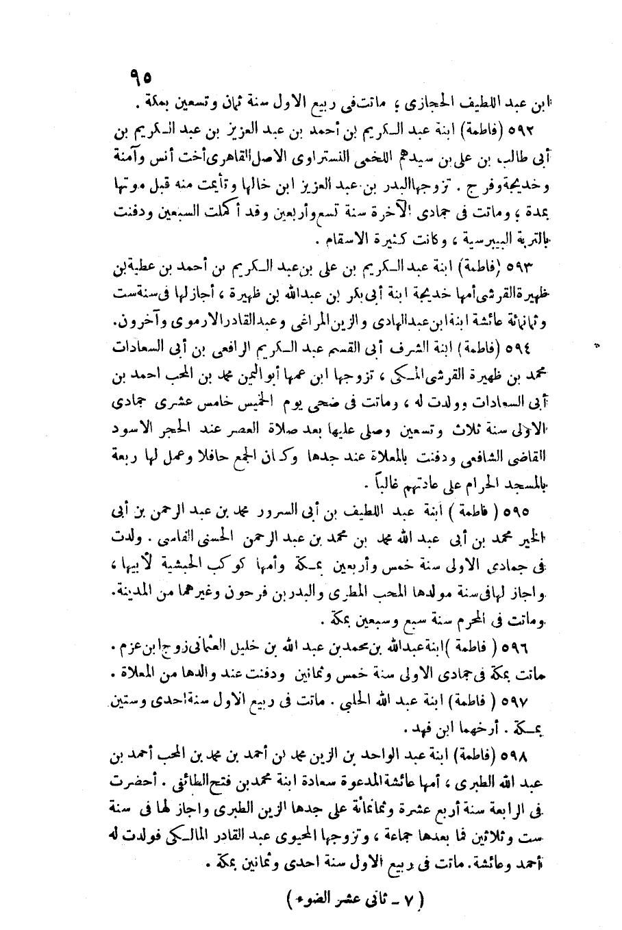 595 - (فَاطِمَة) ابْنة عبد اللَّطِيف بن أبي السرُور مُحَمَّد بن عبد الرَّحْمَن بن أبي الْخَيْر مُحَمَّد بن أبي عبد الله مُحَمَّد بن مُحَمَّد بن عبد الرَّحْمَن الحسني الفاسي. ولدت فِي جُمَادَى الاولى سنة خمس وَأَرْبَعين بِمَكَّة وَأمّهَا كَوْكَب الحبشية لأَبِيهَا، وَأَجَازَ لَهَا فِي سنة مولدها الْمُحب المطري والبدر بن فَرِحُونَ وَغَيرهمَا من الْمَدِينَة. وَمَاتَتْ فِي الْمحرم سنة سبع وَسبعين بِمَكَّة