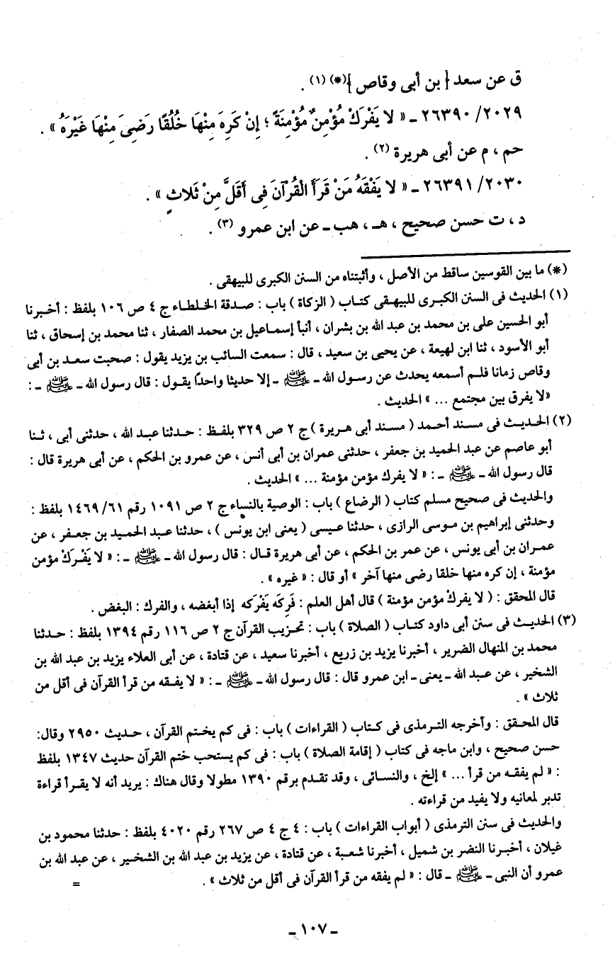2030/ 26391 - "لا يَفْقَهُ مَنْ قَرَأَ الْقُرْآنَ فِي أقَلَّ مِنْ ثَلاثٍ".