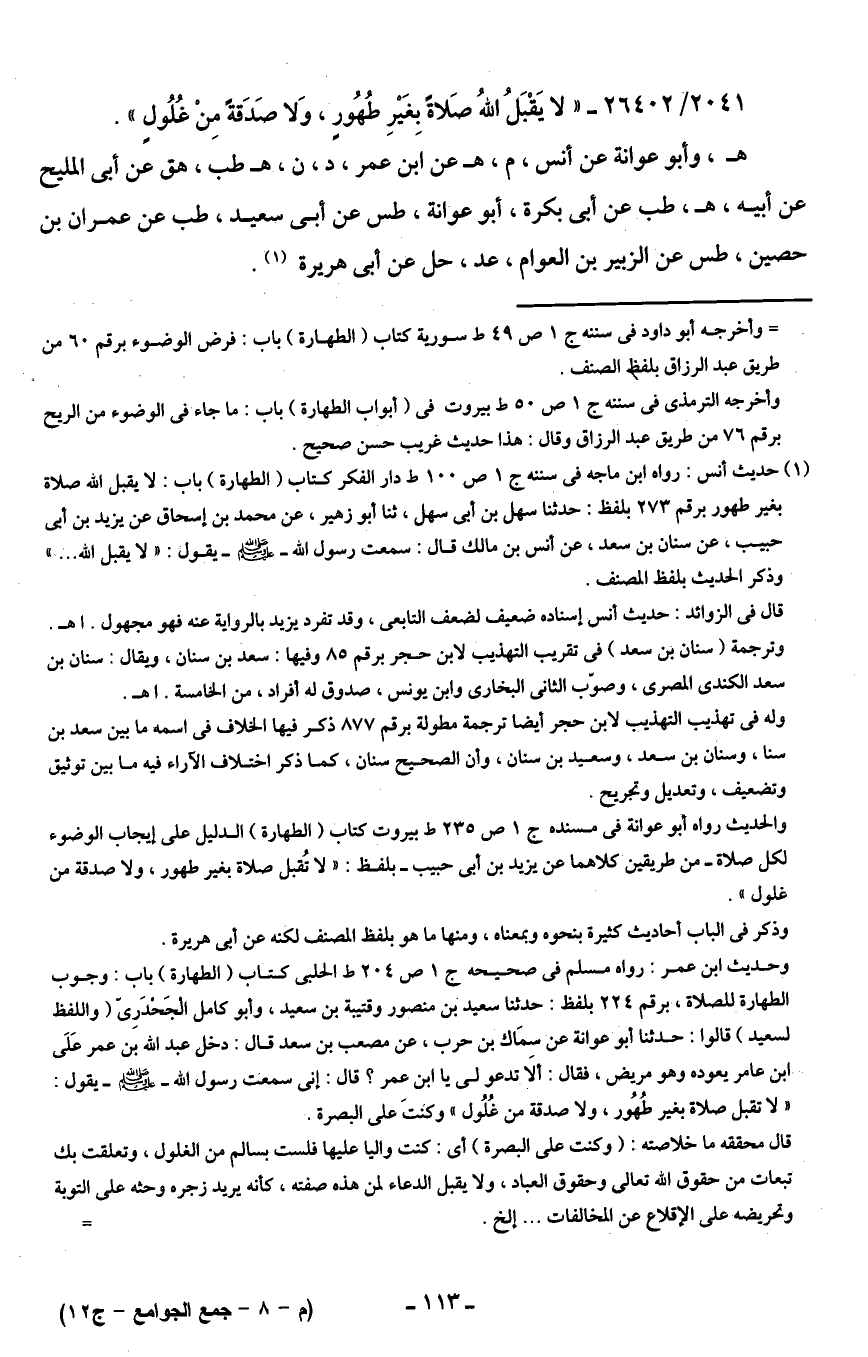 2041/ 26402 - "لا يَقْبَلُ اللهُ صَلاةً بِغَيرِ طُهُورٍ، وَلا صَدَقةً مِنْ غُلُولٍ".