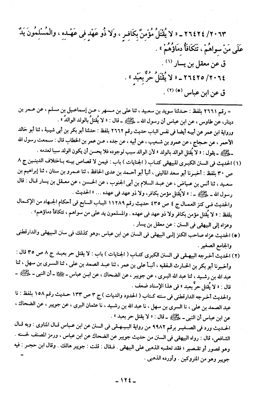 2063/ 26424 - "لا يُقْتَلُ مُؤْمِنٌ بِكَافِرٍ، وَلا ذُو عَهْدٍ فِي عَهْدِهِ، والْمُسْلِمُونَ يَدٌ عَلَى مَنْ سِواهُمْ، تَتكَافَأُ دِمَاؤُهُمْ".