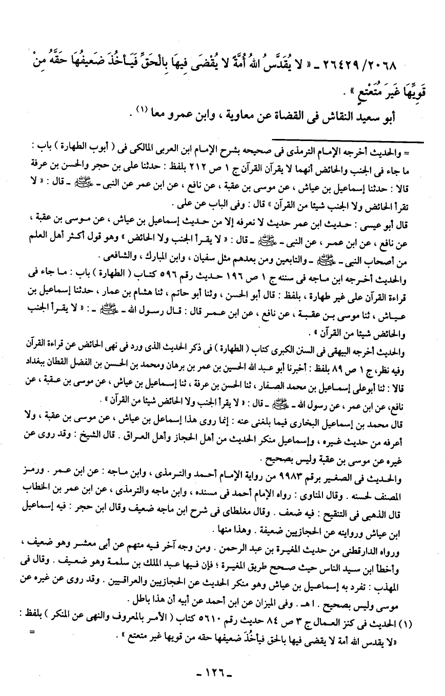 = والحديث أخرجه الإمام الترمذي في صحيحه بشرح الإمام ابن العربي المالكي في (أبوب الطهارة) باب: ما جاء في الجنب والحائض أنهما لا يقرآن القرآن ج 1 ص 212 بلفظ: حدثنا علي بن حجر والحسن بن عرفة قالا: حدثنا إسماعيل بن عياش، عن موسى بن عقبة، عن نافع، عن ابن عمر عن النبي - صلى الله عليه وسلم - قال: "لا تقرأ الحائض ولا الجنب شيئًا من القرآن" قال: وفي الباب عن علي.