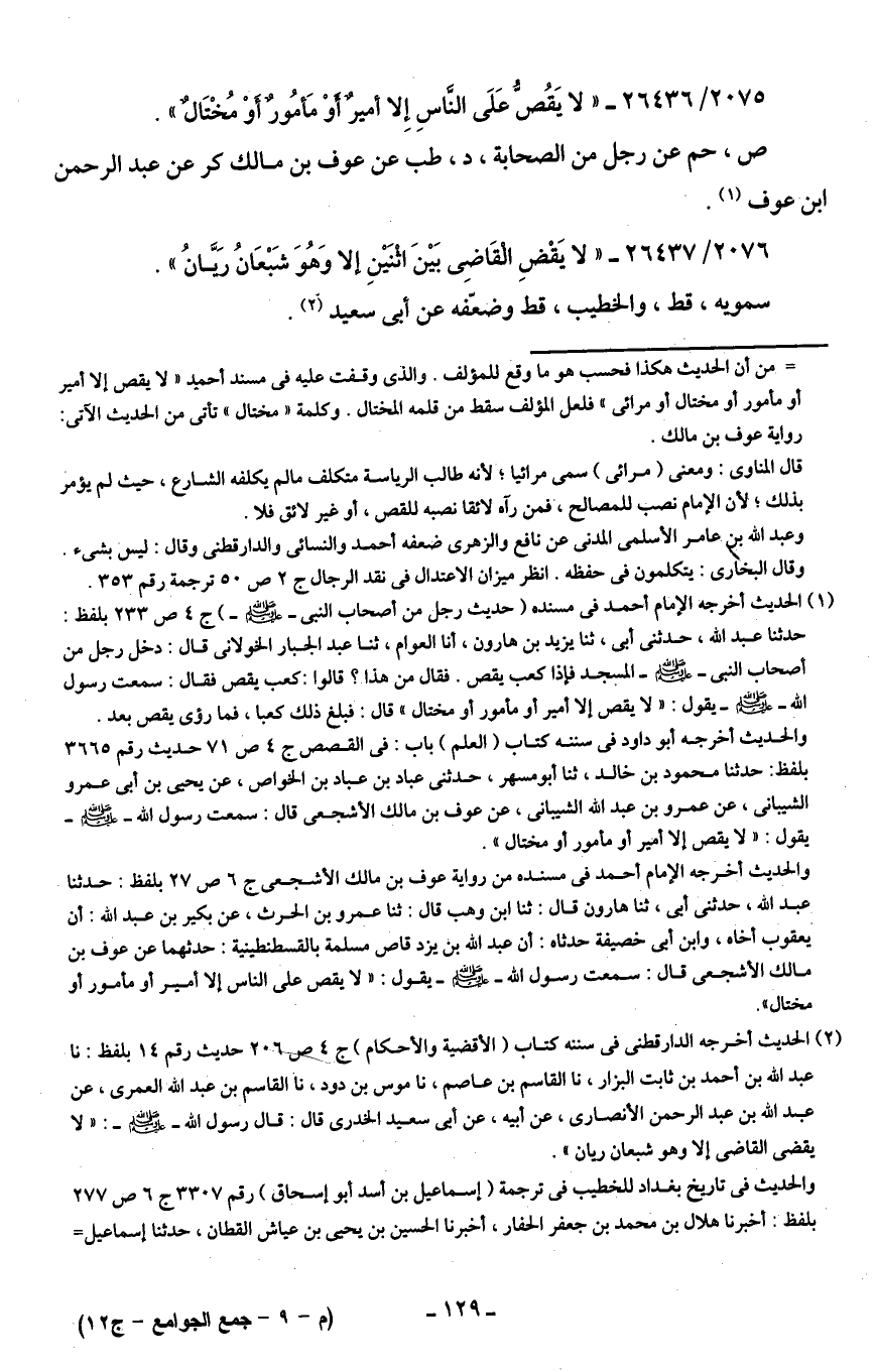 2076/ 26437 - "لا يَقْضِ الْقَاضِي بَينَ اثْنَينِ إلا وَهُوَ شَبْعَانُ رَيَّانُ".