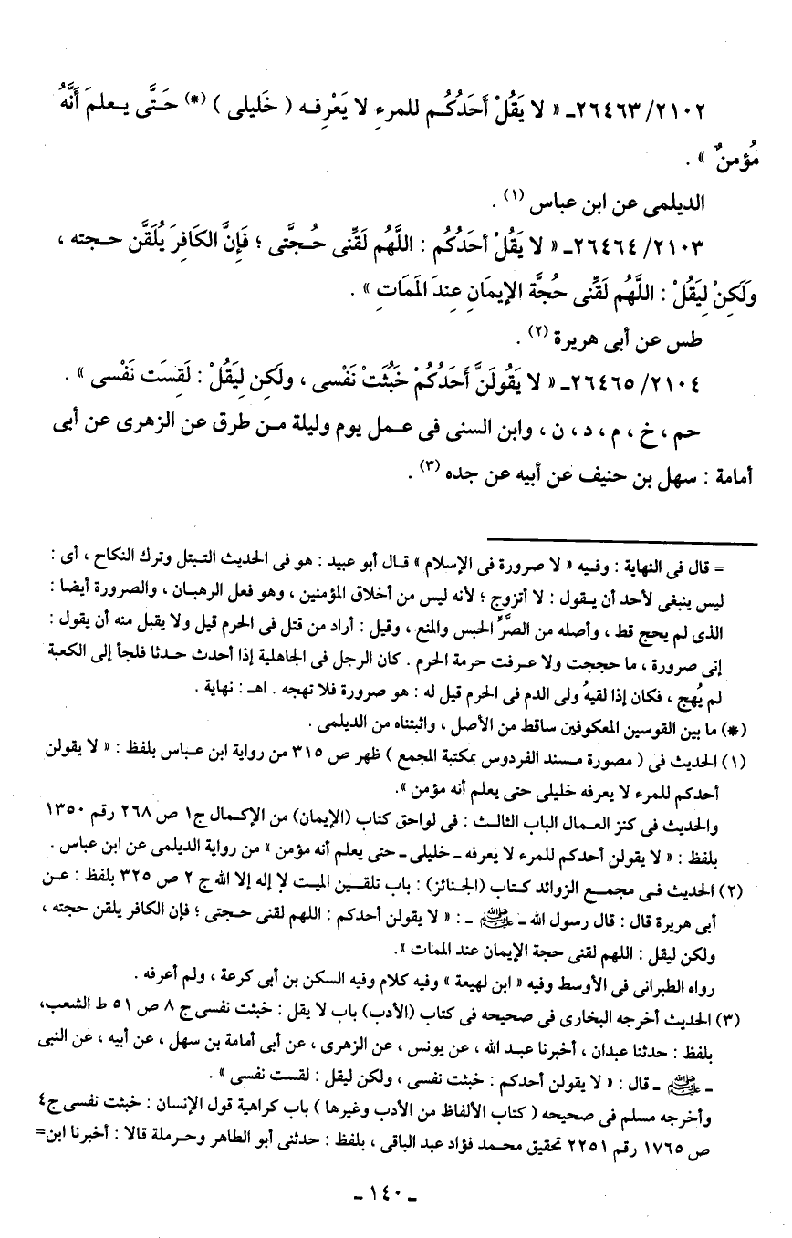 2103/ 26464 - "لا يَقُلْ أحَدُكُم: اللَّهُم لَقِّنى حُجَّتى؛ فَإِنَّ الكَافِرَ يُلَقَّن حجته، وَلَكِنْ لِيَقُلْ: اللَّهُم لَقِّنى حُجَّة الإيمَانِ عِندَ المَمَاتِ".