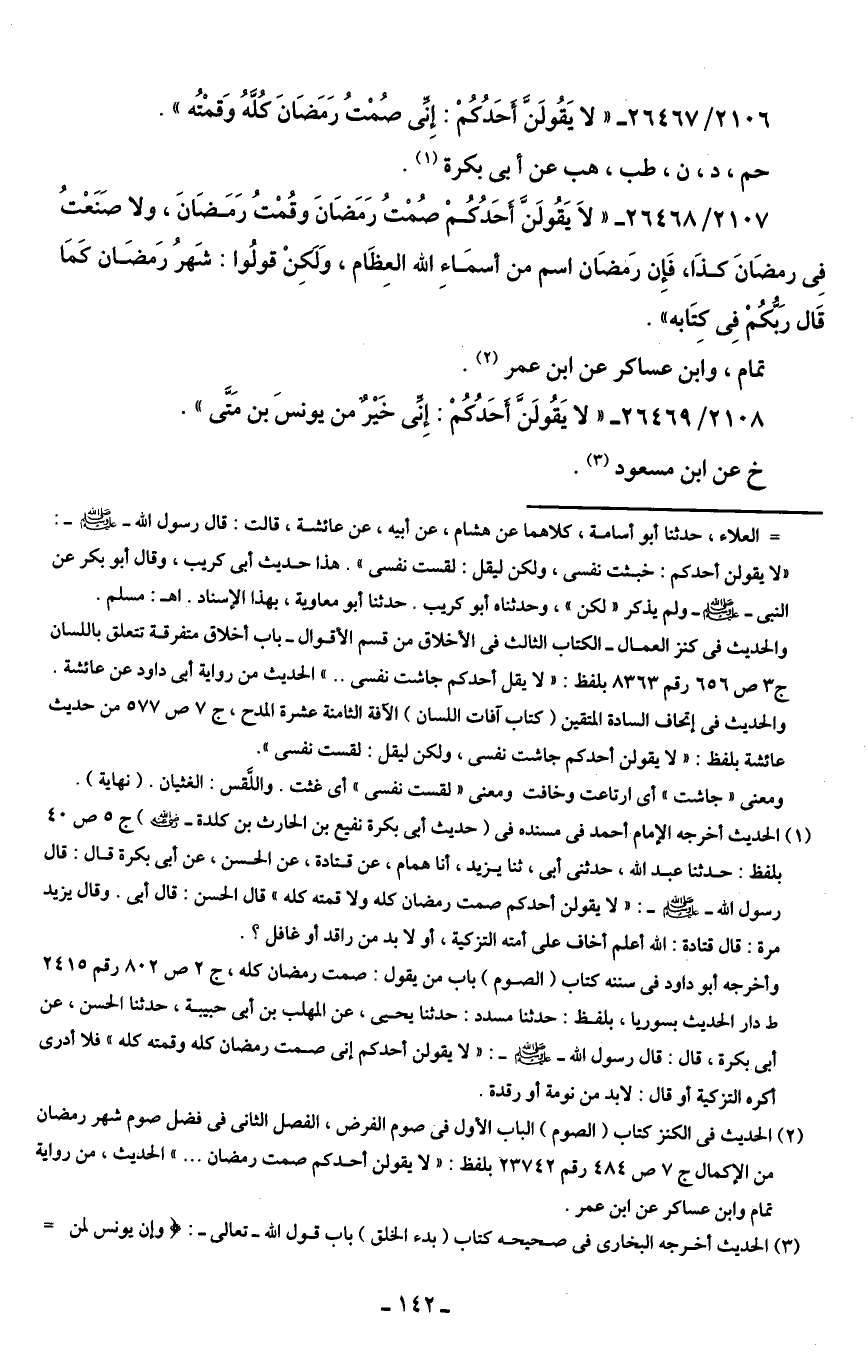 2106/ 26467 - "لا يَقُولَنَّ أحَدُكُمْ: إِنِّي صُمْتُ رَمَضَانَ كلَّهُ وَقمْتُه".