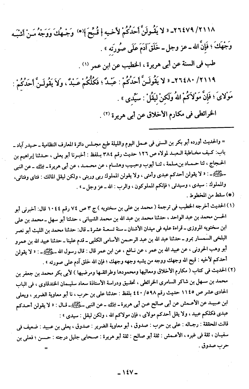(¬2) الحديث في كتاب (مكارم الأخلاق ومعاليها ومحمودها وطرائقها ومرضيها) لأبي بكر محمد بن جعفر بن محمد بن سهل بن شاكر السامري الخرائطي، تحقيق ودراسة الأستاذة سعاد سليمان الخندقاوى، في الباب الحادي عشر ص 1145 حديث رقم 598/ 440 بلفظ: حدثنا علي بن حرب، نا أبو معاوية الضرير، ويعلى بن عبيد عن الأعمش عن أبي صالح عن أبي هريرة - رضي الله عنه - عن النبي - صلى الله عليه وسلم - قال: "لا يقولن أحدكم عبدى فكلكم عبيد، ولا يقل أحدكم مولاى، فإن مولاكم الله، ولكن ليقل: سيدى":