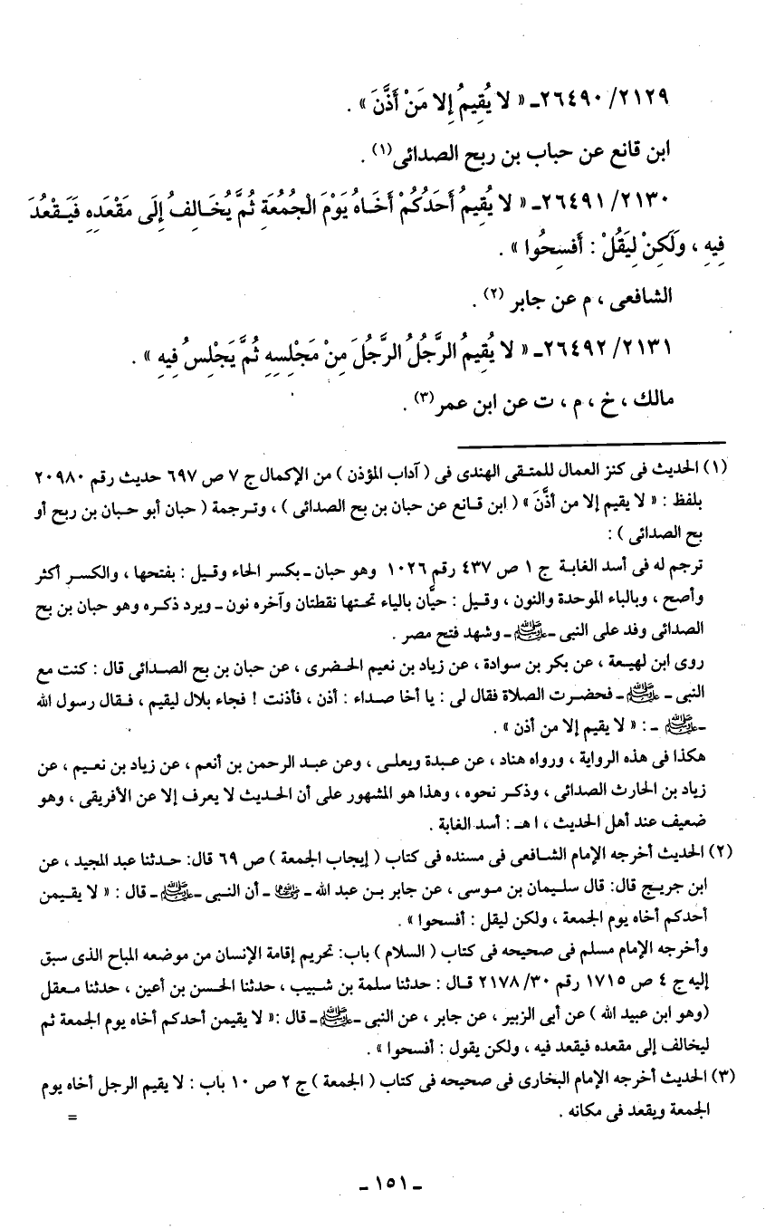2130/ 26491 - "لا يُقِيمُ أحَدُكُمْ أخَاهُ يَوْمَ الجُمُعَة ثُمَّ يُخَالفُ إِلَى مَقْعَده فَيَقْعُدَ فِيهِ، وَلكِنْ لِيَقُلْ: أفسِحُوا".