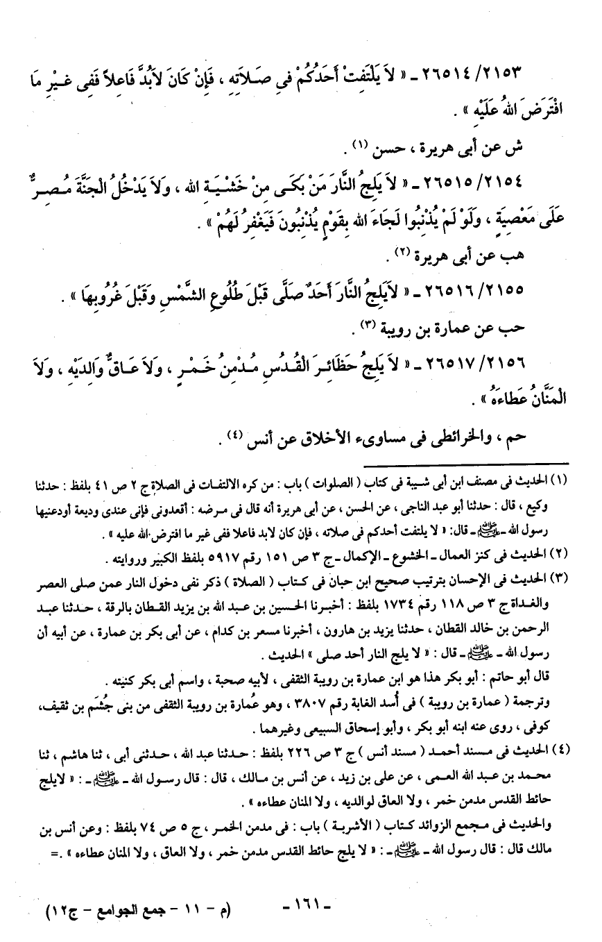 2155/ 26516 - "لَا يَلِجُ النَّارَ أحَدٌ صلَّى قبلَ طُلُوع الشَّمْسِ وَقَبْلَ غُرُوبِهَا".