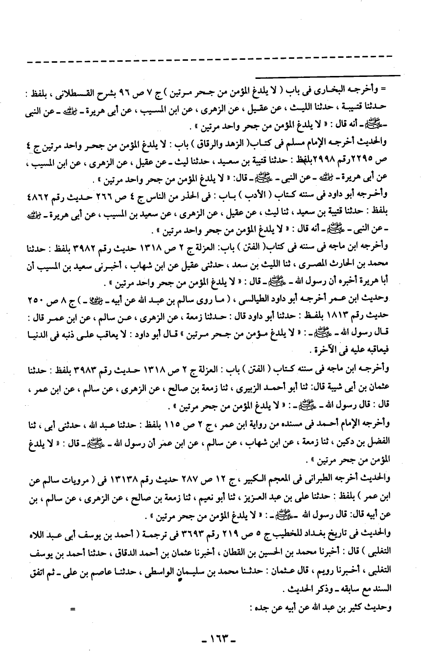 وأخرجه ابن ماجه في سننه كتاب (الفتن) باب: العزلة ج 2 ص 1318 حديث رقم 3983 بلفظ: حدثنا عثمان بن أبي شيبة قال: ثنا أبو أحمد الزبيرى، ثنا زمعة بن صالح، عن الزهري، عن سالم، عن ابن عمر، قال: قال رسول الله - صلى الله عليه وسلم -: "لا يلدغ المؤمن من جحر مرتين".