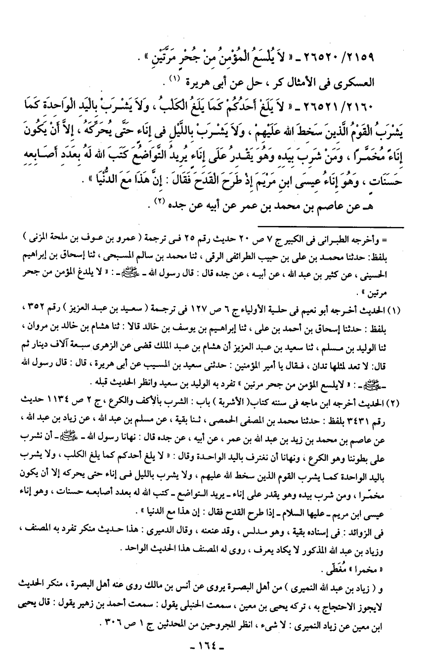 2160/ 26521 - "لَا يَلَغ أحَدُكُمْ كمَا يَلَغُ الكلبُ، وَلَا يَشْرَبْ باليَد الوَاحدَةِ كمَا يَشْرَبُ القَوْمُ الَّذِينَ سَخِطَ الله عَلَيهِمْ، وَلَا يَشْرَبْ بِاللَّيلِ في إِنَاءٍ حَتَّى يُحَرِّكهُ، إِلا أن يَكُونَ إِنَاءً مُخَمَّرًا، وَمَنْ شَرِبَ بِيَدِهِ وَهوَ يَقْدِرُ عَلَى إِنَاءٍ يُرِيدُ التَّوَاضُع كتَبَ الله لَهُ بِعَدَدِ أصَابِعِهِ حَسَنَاتٍ، وَهوَ إِنَاءُ عِيسَى ابنِ مَرْيَمَ إِذ طَرَحَ القَدَح فَقَال: إِنَّ هَذَا مَعَ الدُّنْيَا".