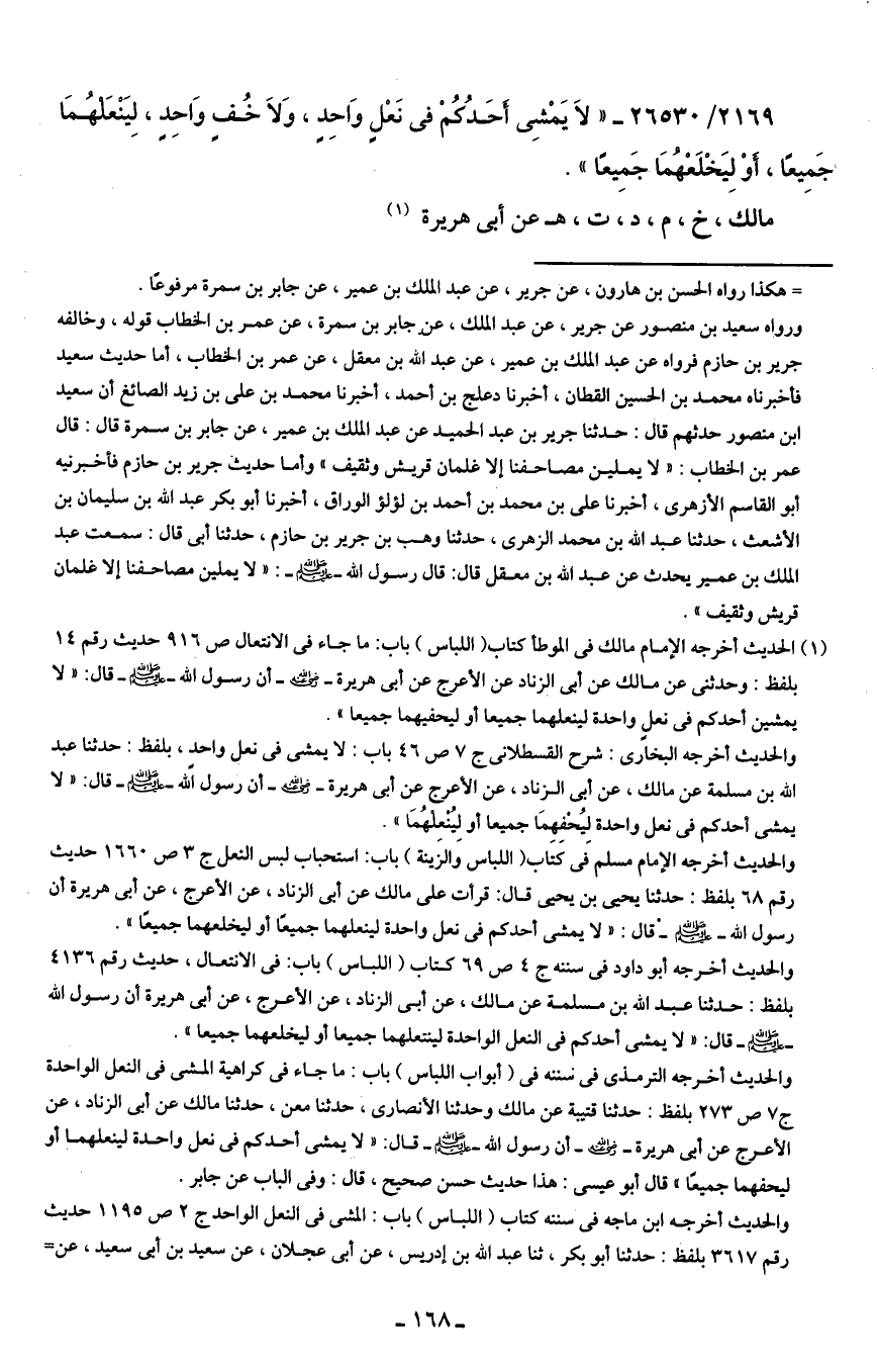 2169/ 26530 - "لَا يَمْشِي أحَدُكُمْ في نَعْلٍ وَاحِدٍ، وَلَا خُفٍ وَاحِدٍ، لِيَنْعَلهُمَا جَمِيعًا، أوْ لِيَخْلَعْهُمَا جَمِيعًا".