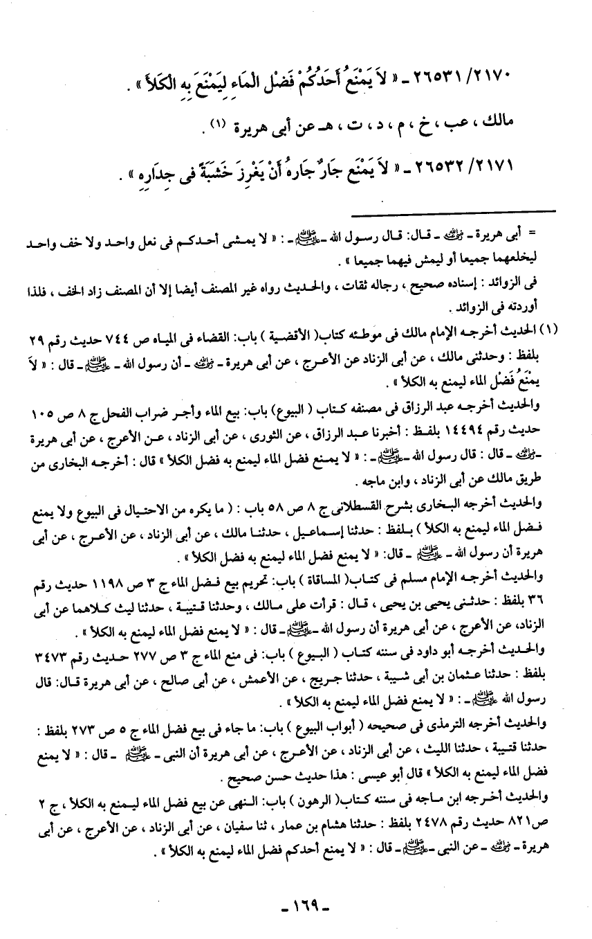 2170/ 26531 - "لَا يَمْنَعُ أحَدُكُمْ فَضْل المَاءِ لِيَمْنَعَ بِهِ الكَلأَ".