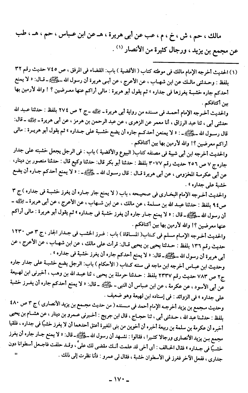 (¬1) الحديث أخرجه الإمام مالك في موطئه كتاب (الأقضية) باب: القضاء في المرفق، ص 745 حديث رقم 32 بلفظ: وحدثني مالك عن ابن شهاب، عن الأعرج، عن أبي هريرة أن رسول الله - صلى الله عليه وسلم - قال: ، لا يمنع أحدكم جاره خشبة يغرزها في جداره" ثم يقول أبو هريرة: ما لي أراكم عنها معرضين؟ ! والله لأرمين بها بين أكتافكم.