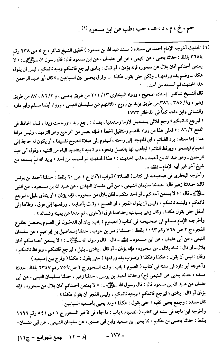 (¬1) الحديث أخرجه الإمام أحمد في مسنده (مسند عبد الله بن مسعود) تحقيق الشيخ شاكر، ج 5 ص 238 رقم 3654 بلفظ: حدثنا يحيى، عن التيمي، عن أبي عثمان، عن ابن مسعود قال: قال رسول الله - صلى الله عليه وسلم -: "لا يمنعن أحدكم أذان بلال عن سحوره فإنه يؤذن، أو قال: ينادى ليرجع قائمكم وينبه نائمكم، ليس أن يقول هكذا -وضم يده ورفعها- ولكن حتى يقول هكذا: -وفرق يحيى بين السبابتين-" قال أبو عبد الرحمن: هذا الحديث لم أسمعه من أحد.