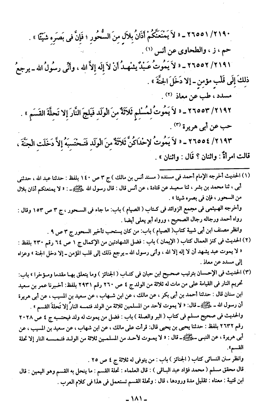 2192/ 26553 - "لَا يَمُوتُ لِمُسْلِمٍ ثَلاثَةٌ مِنَ الوَلَدِ فَيَلجَ النَّارَ إِلا تَحِلَّةَ القَسَم".