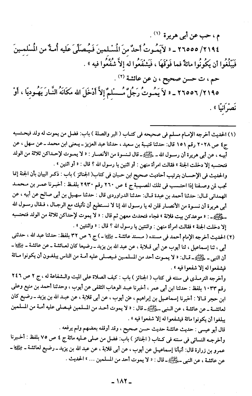 (¬2) الحديث أخرجه الإمام أحمد في مسنده (مسند عائشة - رضي الله عنها -) ج 6 ص 32 بلفظ: حدثنا عبد الله، حدثني أبي، ثنا إسماعيل، ثنا أيوب عن أبي قلابة، عن عبد الله بن يزيد -رضيعا كان لعائشة- عن عائشة - رضي الله عنها - أن النبي - صلى الله عليه وسلم - قال: "لا يموت أحد من المسلمين فيصلى عليه أمة من الناس يبلغون أن يكونوا مائة فيشفعوا له إلا شفعوا فيه".