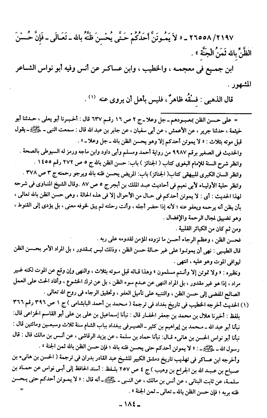 2197/ 26558 - "لَا يَمُوتَنَّ أحَدُكُمْ حَتَّى يُحْسِنَ ظَنَّهُ بالله -تَعَالى- فَإنَّ حُسْنَ الظَّنِّ بِالله ثَمَنُ الجَنَّةِ".