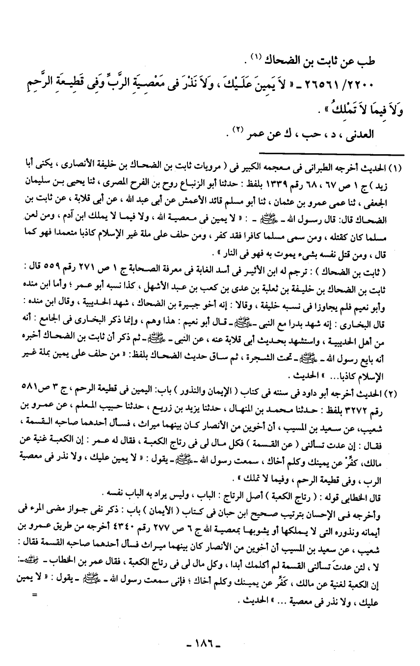 2200/ 26561 - "لَا يَمِينَ عَلَيكَ، وَلَا نَذْرَ في مَعْصِيَةِ الرَّبِّ وَفِي قَطِيعَةِ الرَّحِم ولا فِيمَا لَا تَمْلِكُ".