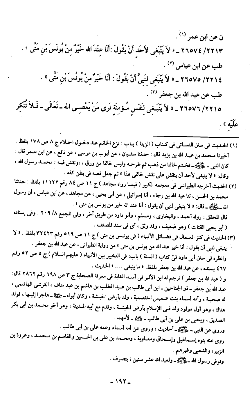 (¬3) الحديث في كنز العمال في فضائل الأنبياء (في يونس بن متى) ج 11 ص 519 رقم 32423 بلفظ: "لا ينبغي لنبي أن يقول: أنا خير عند الله من يونس بن متى من رواية الطبراني، عن عبد الله بن جعفر.