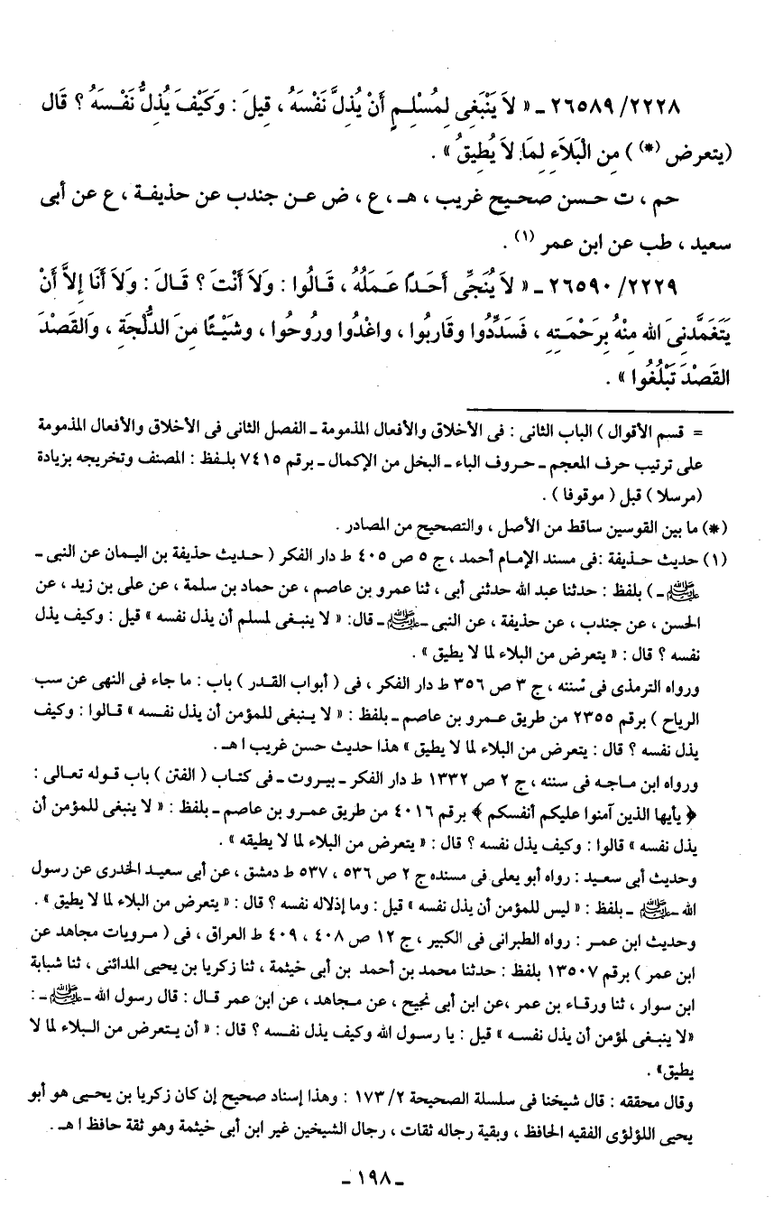 2228/ 26589 - "لَا يَنْبَغِي لِمُسْلِمٍ أنْ يُذِلَّ نَفْسَهُ، قِيلَ: وَكَيفَ يُذِلُّ نَفْسَهُ؟ قَال (يتعرض (*)) مِن الْبَلَاءِ لِمَا لَا يُطِيقُ".