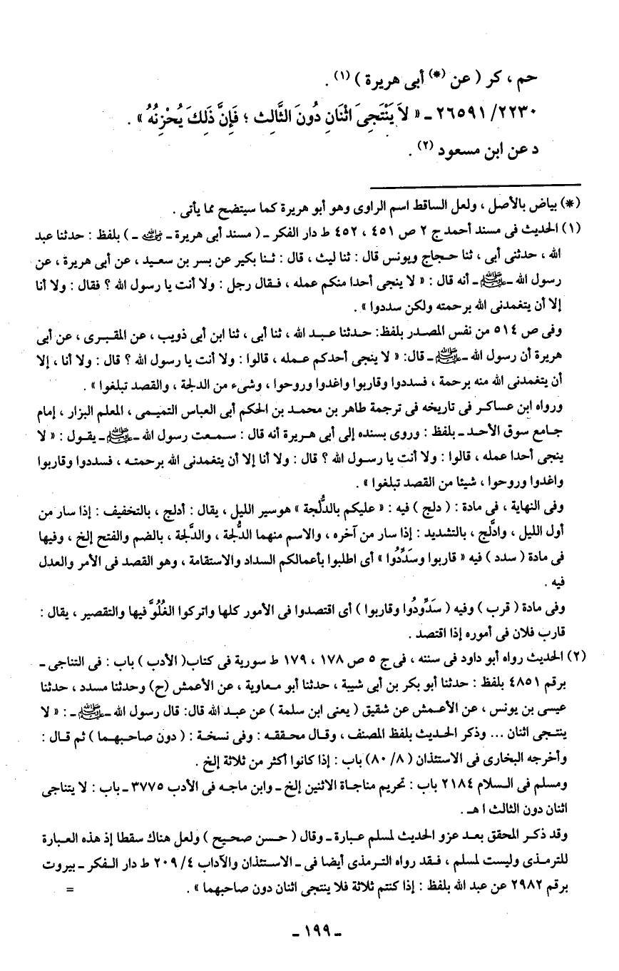 2230/ 26591 - "لَا يَنْتَجِي اثْنَانِ دُونَ الثَّالِث؛ فَإِنَّ ذَلِكَ يُحْزِنُهُ".