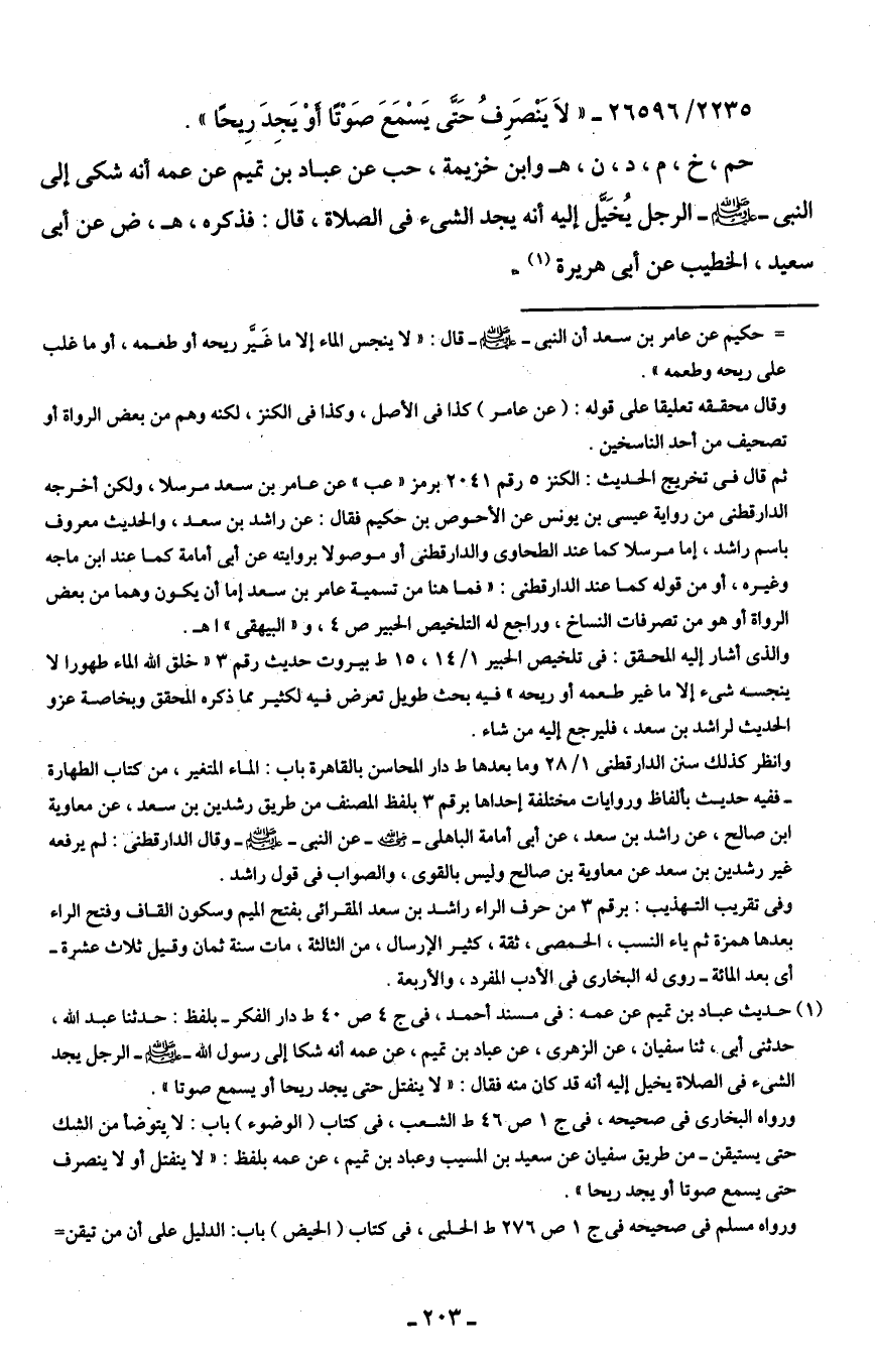 (¬1) حديث عباد بن تميم عن عمه: في مسند أحمد، في ج 4 ص 40 ط دار الفكر - بلفظ: حدثا عبد الله، حدثني أبي، ثنا سفيان، عن الزهري، عن عباد بن تميم، عن عمه أنه شكا إلى رسول الله - صلى الله عليه وسلم - الرجل يجد الشيء في الصلاة يخيل إليه أنه قد كان منه فقال: "لا ينفتل حتى يجد ريحا أو يسمع صوتا".