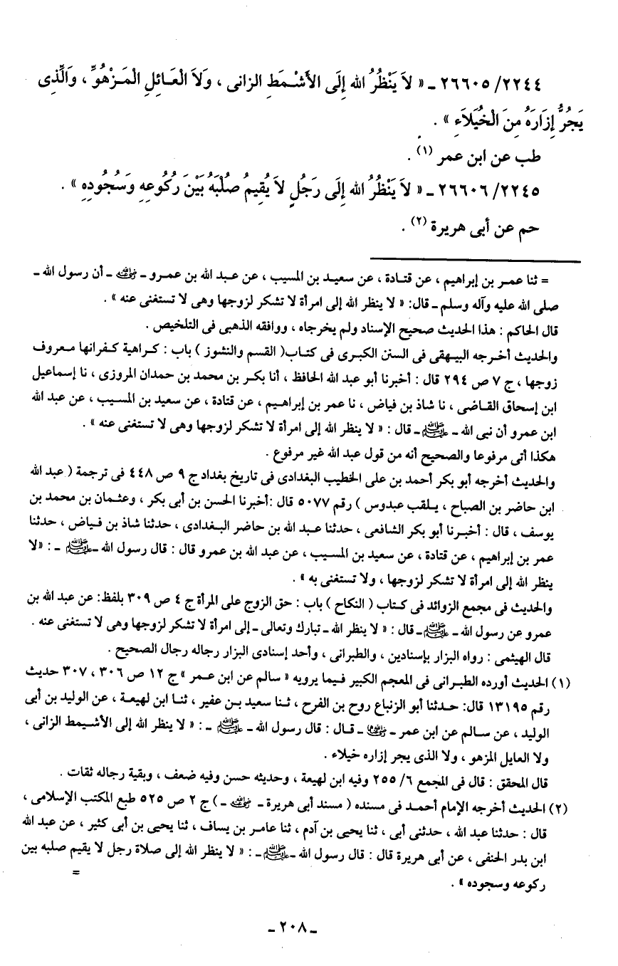 2244/ 26605 - "لَا يَنْظُرُ الله إِلَى الأشْمَطِ الزاني، وَلَا الْعَائِلِ الْمَزْهُوِّ، وَالَّذِي يَجُرُّ إِزَارَهُ مِنَ الْخُيَلَاءِ".