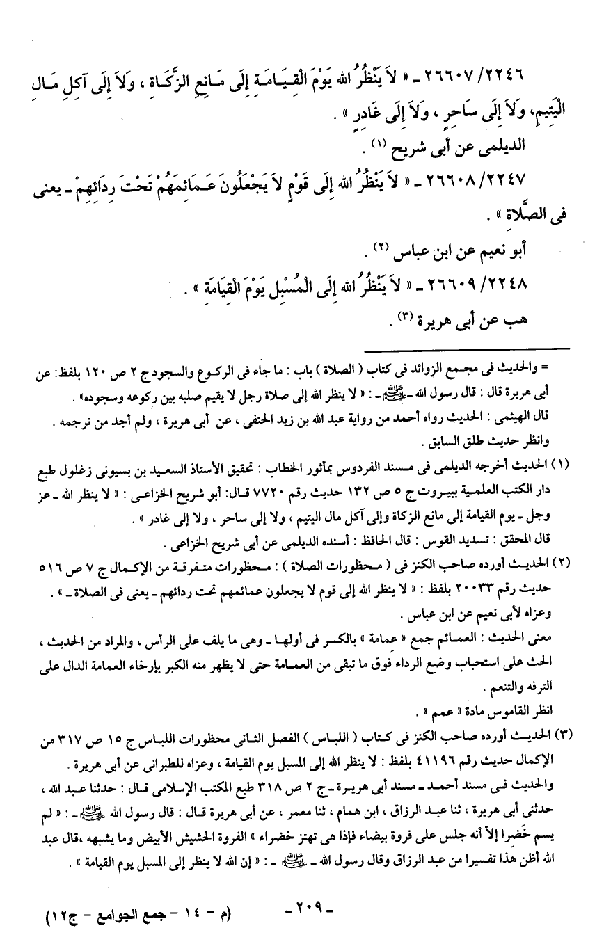 2246/ 26607 - "لَا يَنْظُرُ الله يَوْمَ الْقِيَامَة إِلَى مَانِعِ الزَّكَاة، وَلَا إِلَى آكِلِ مَالِ الْيَتِيمِ، وَلَا إِلَى سَاحِرٍ، وَلَا إِلَى غَادِرٍ".