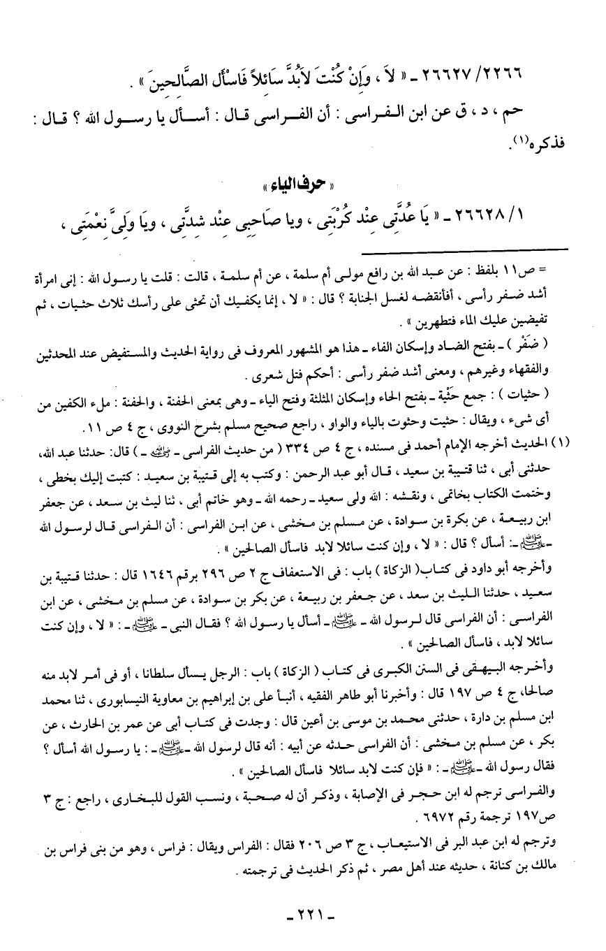 وأخرجه أبو داود في كتاب (الزكاة) باب: في الاستعفاف ج 2 ص 296 برقم 1646 قال: حدثنا قتيبة بن سعيد، حدثنا الليث بن سعد، عن جعفر بن ربيعة، عن بكر بن سوادة، عن مسلم بن مخشى، عن ابن الفراسى: أن الفراسى قال لرسول الله - صلى الله عليه وسلم -.- أسأل يا رسول الله؟ فقال النبي - صلى الله عليه وسلم -: "لا، وإن كنت سائلا لابد، فاسأل الصالحين".