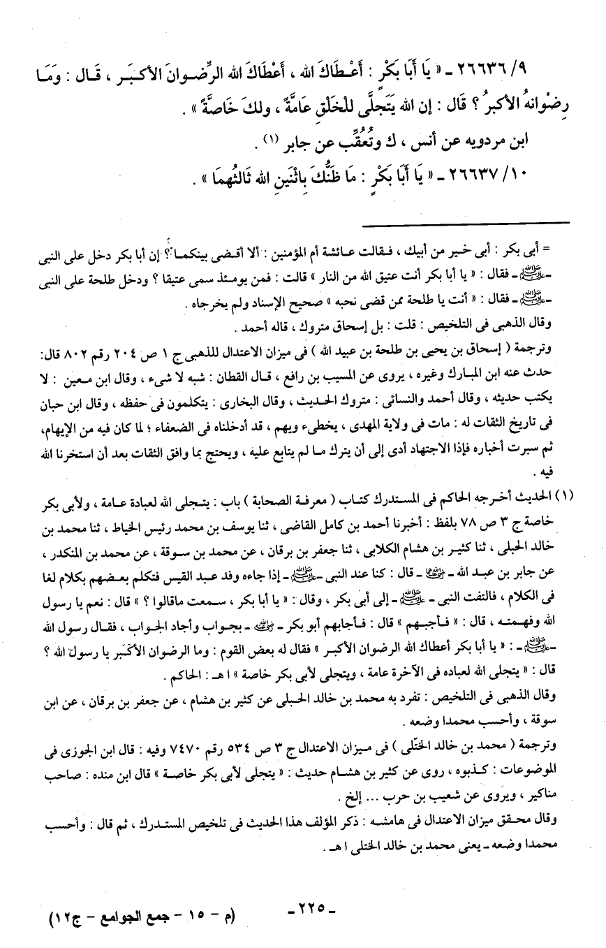 9/ 26636 - "يَا أَبَا بَكْرٍ: أَعْطَاكَ الله، أَعْطَاكَ الله الرِّضوانَ الأكبَر، قَال: وَمَا رِضْوانهُ الأكبرُ؟ قَال: إن الله يَتَجلَّى للخَلقِ عَامَّةً، ولكَ خَاصَّة".