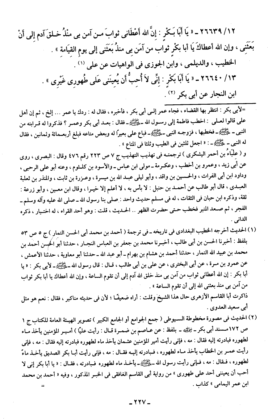 12/ 26639 - "يَا أَبَا بَكْرٍ: إِنَّ الله أَعْطَانى ثوابَ من آمن بي منْذُ خلقَ آدم إِلى أَنْ بَعَثَنِي، وإن الله أعطاكَ يَا أبا بكْرٍ ثواب من آمَن بِي منذُ بَعَثَنى إلى يومِ القِيَامةِ".