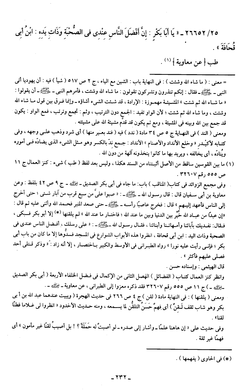 25/ 26652 - "يَا أَبَا بَكْرٍ: إِنَّ أَفْضَلَ النَّاسِ عِنْدِى في الصُّحْبَةِ وَذَاتِ يَدِهِ: ابْنُ أبِي قُحَافَةَ".