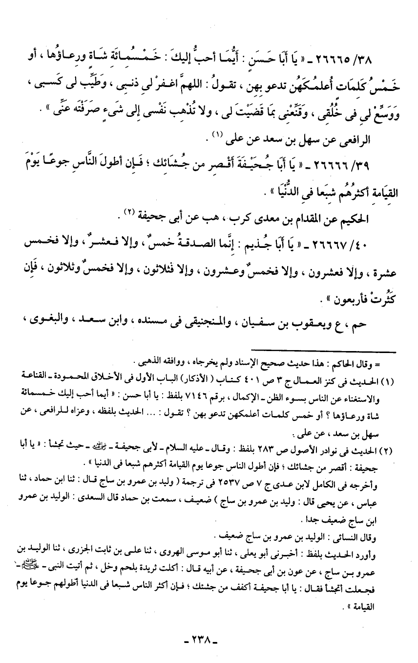 38/ 26665 - "يَا أَبَا حَسَنٍ: أَيُّمَا أحبُّ إليكَ: خَمْسُمِائَةِ شَاةٍ ورِعاؤُها، أو خَمْسُ كَلِمَاتٍ أُعلمُكَهُن تدعو بِهِن، تقولُ: اللهمَّ اغفرْ لي ذنبِى، وَطَيِّب لي كَسبى، وَوَسِّعْ لي في خُلُقِى، وَقَنِّعْنِي بمَا قَضَيْتَ لي، ولا تُذْهِب نَفْسى إِلى شَئٍ صَرَفْتَه عَنِّى".