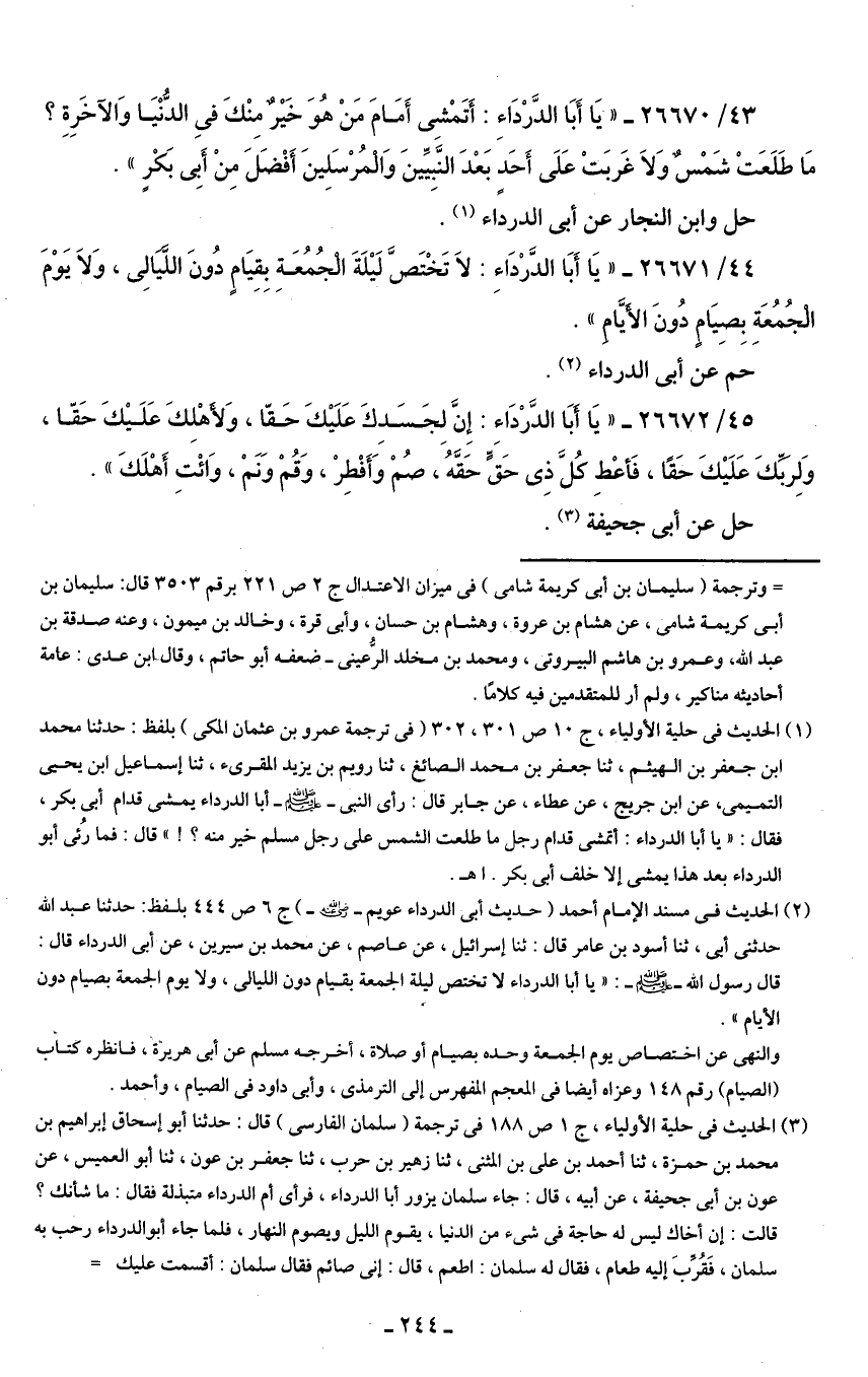 44/ 26671 - "يَا أَبَا الدَّرْدَاءِ: لاَ تَخْتَصَّ لَيْلَةَ الْجُمُعَةِ بِقِيَامٍ دُونَ اللَّيَالِى، وَلاَ يَوْمَ الْجُمُعَةِ بِصِيَامٍ دُونَ الأَيَّامِ".