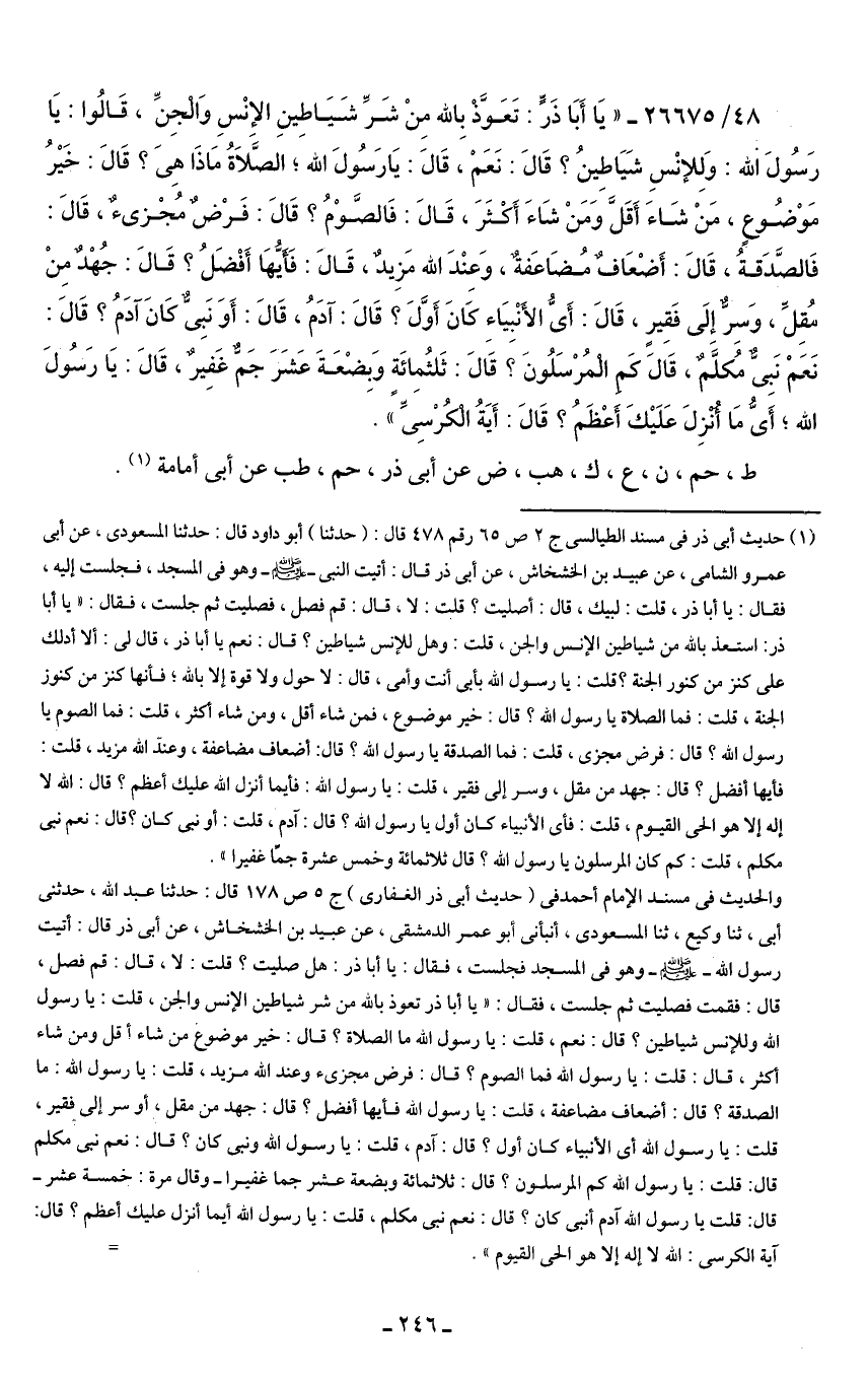 48/ 26675 - "يَا أَبَا ذَرٍّ: تَعَوَّذْ بِالله مِنْ شَرِّ شَيَاطِينِ الإِنْسِ وَالْجِنِّ، قَالُوا: يَا رَسُولَ الله: وَلِلإنْسِ شَيَاطِينُ؟ قَالَ: نَعَمْ، قَالَ: يَا رَسُولَ الله؛ الصَّلاَةُ مَاذَا هِىَ؟ قَالَ: خَيْرُ مَوْضُوعٍ، مَنْ شَاءَ أَقَلَّ وَمَنْ شَاءَ أَكْثَرَ، قَالَ: فَالصَّوْمُ؟ قَالَ: فَرْضٌ مُجْزئٌ، قَالَ: فَالصَّدَقةُ، قَالَ: أَضْعَافٌ مُضَاعَفةٌ، وَعِنْدَ الله مَزِيدٌ، قَالَ: فَأَيُّهَا أَفْضَلُ؟ قَالَ: جُهْدٌ مِنْ مُقِلِّ، وَسِرٌّ إِلَى فَقِيرٍ، قَالَ: أَىُّ الأَنْبِيَاءِ كَانَ أَوَّلَ؟ قَالَ: آدَمُ، قَالَ: أَوَ نَبِىٌّ كَانَ آدَمُ؟ قَالَ: نَعَمْ نَبِىٌّ مُكلَّمٌ، قَالَ كَمِ الْمُرْسَلُونَ؟ قَالَ: ثَلثُمِائَةٍ وَبِضْعَةَ عَشَرَ جَمٌّ غَفِيرٌ، قَالَ: يَا رَسُولَ الله؛ أَىُّ مَا أُنْزِلَ عَلَيْكَ أَعْظَمُ؟ قَالَ: أَيَةُ الْكُرْسِىِّ".
