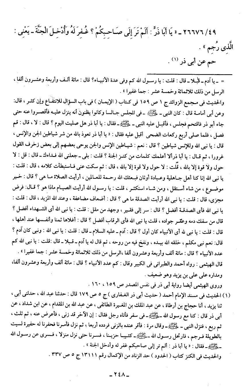 49/ 26676 - "يَا أَبَا ذَرٍّ: أَلَمْ تَرَ إِلَى صَاحِبِكُمْ؟ غُفِرَ لَهُ وَأُدْخِلَ الْجَنَّةَ -يَعْنِي: الَّذِي رُجِم".