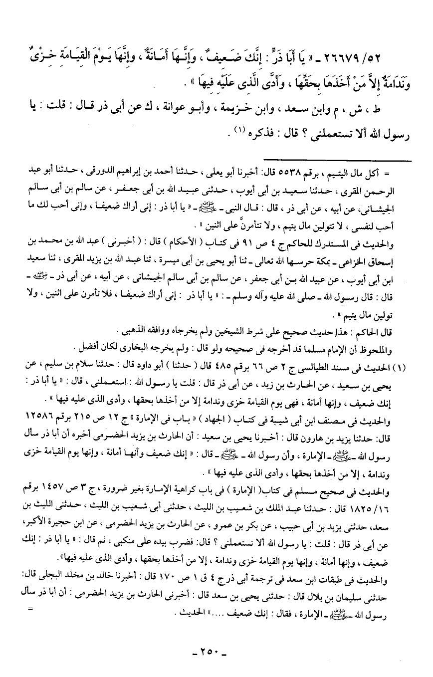 52/ 26679 - "يَا أَبَا ذَرٍّ: إِنَّكَ ضَعِيفٌ، وَإِنَّهَا أَمَانَةٌ، وإِنَّهَا يَوْمَ الْقِيَامَةِ خِزْىٌ وَنَدَامَةٌ إِلَّا مَنْ أَخَذَهَا بِحَقِّهَا، وَأَدَّى الَّذِي عَلَيْهِ فِيهَا".