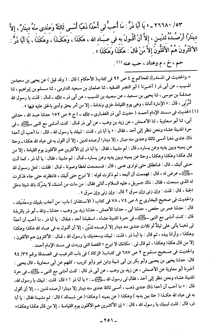 53/ 26680 - "يَا أَبَا ذَرٍّ: مَا أُحِبُّ لي أُحُدًا ذَهَبًا أُمْسِى ثَالِثَةً وَعِنْدِى مِنْهُ دِينَارٌ، إِلَّا دِينَارًا أَرْصُدُهُ لِدْينٍ، إِلَّا أَنْ أَقُولَ بِهِ في عِبَادِ الله، هَكَذَا، وَهَكَذَا، وهَكَذَا، يَا أَبَا ذَرٍّ: الأكْثَرُونَ هُمُ الأَقَلُّونَ إِلَّا مَنْ قَالَ: هَكَذَا وَهَكَذَا".
